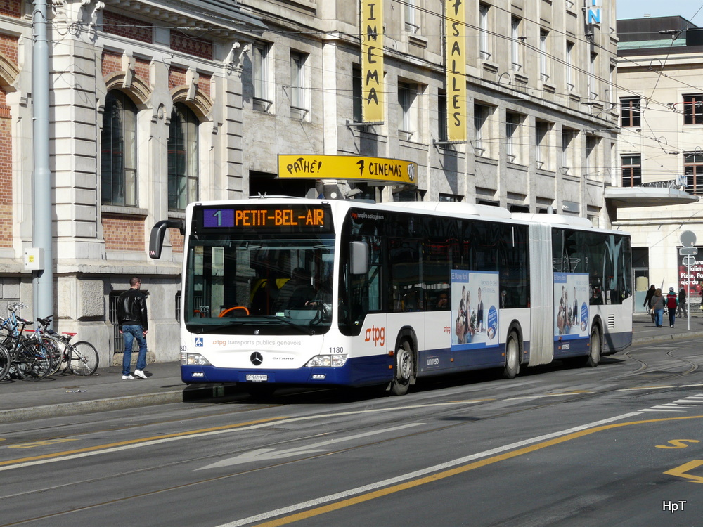 TPG Genf - Mercedes Citaro Nr.1180  GE 960930 unterwegs auf der Linie 1 in der Stadt Genf am 18.02.2012