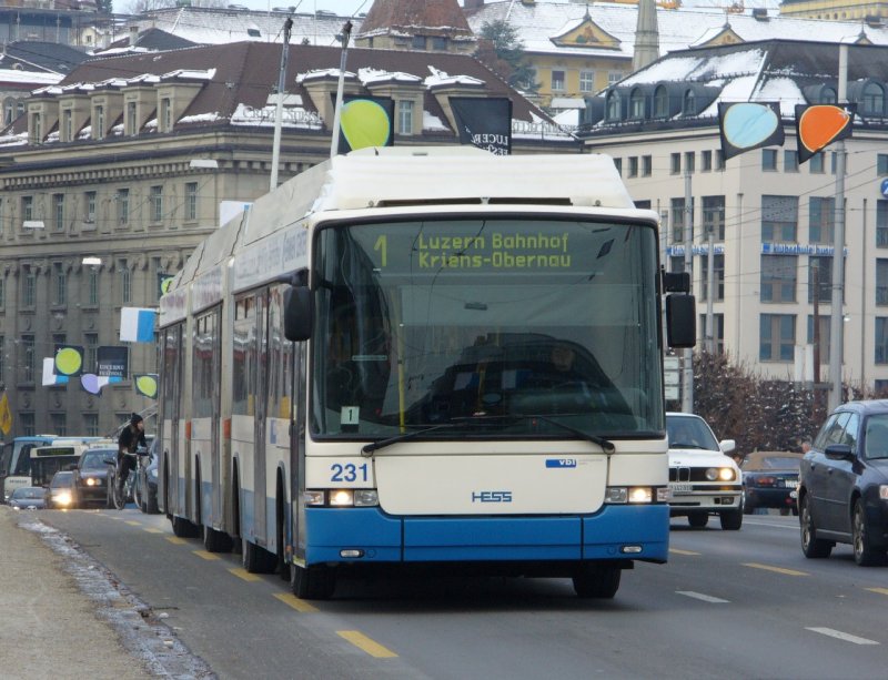 VBL - 3 Teiliger Trolleybus Nr.231 mit der Bezeichnunung LighTram3. auf der Seebrücke vor dem Bahnhof in Luzern am 18.11.2007