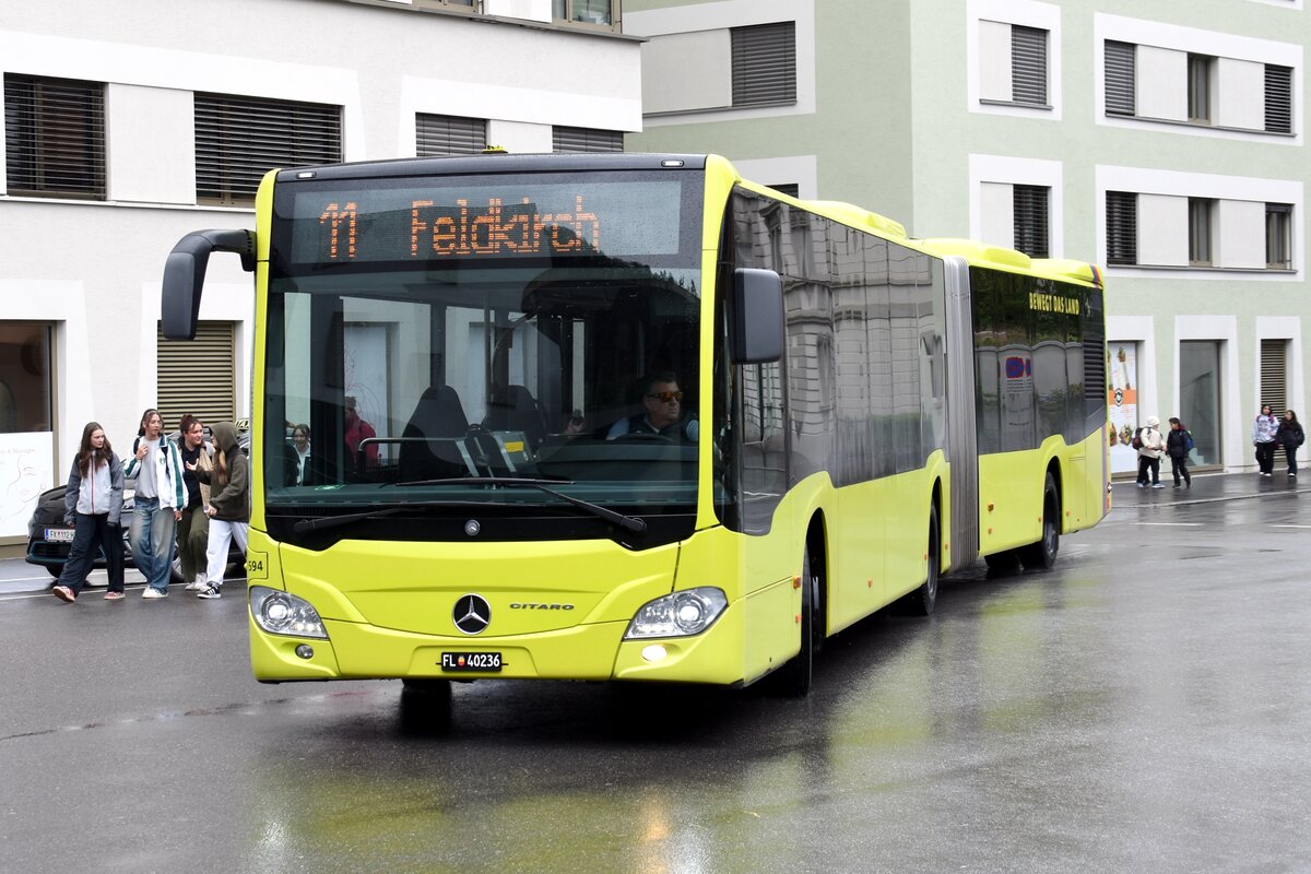 FELDKIRCH (Vorarlberg), 25.04.2025, der Liechtensteiner Bus 594 als Linie 11 nach Feldkirch fährt in die Endhaltestelle am Bahnhof Feldkirch ein
