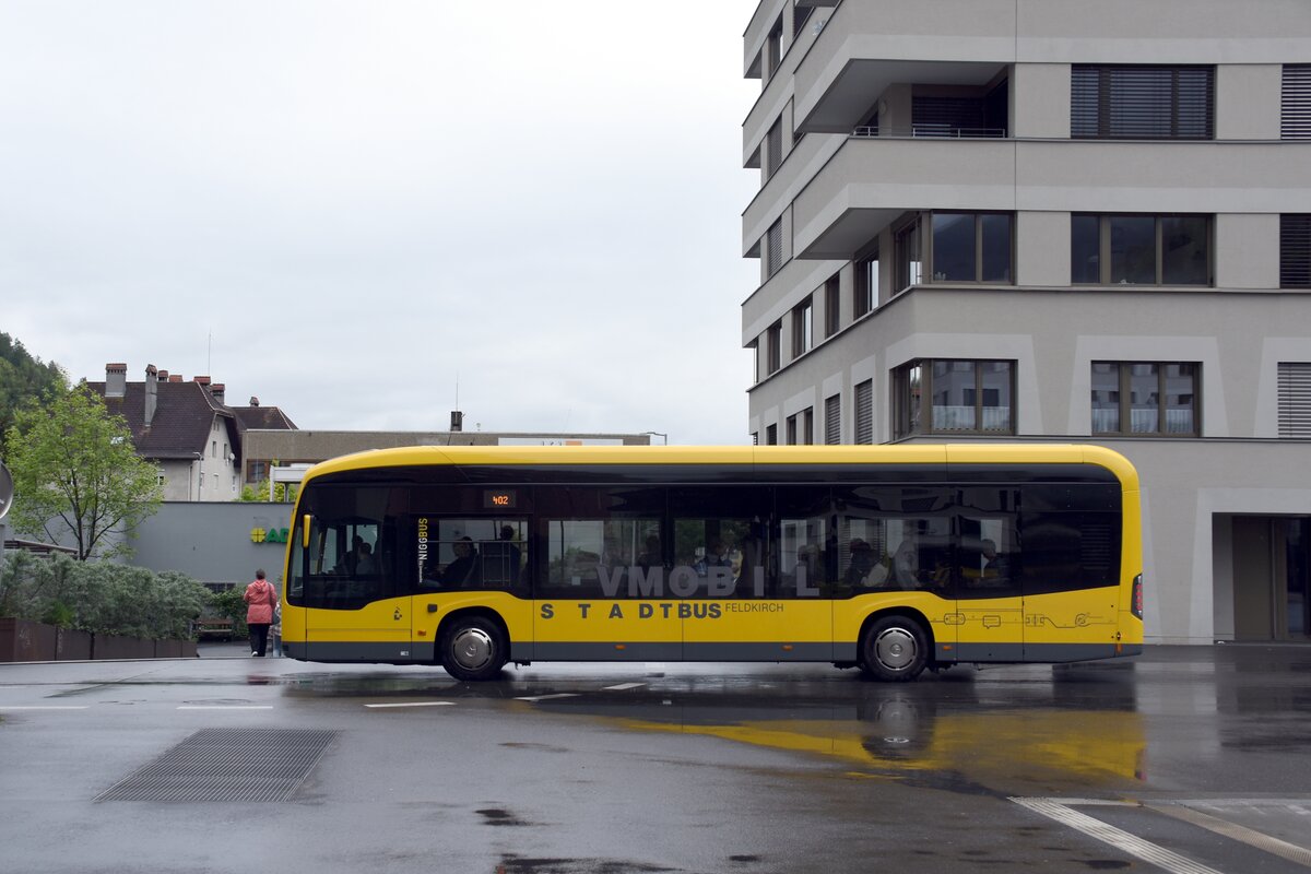 FELDKIRCH (Vorarlberg), 25.04.2025, Stadtbus Feldkirch mit der Liniennummer 402 hat soeben die zentrale Haltestelle am Bahnhof Feldkirch verlassen
