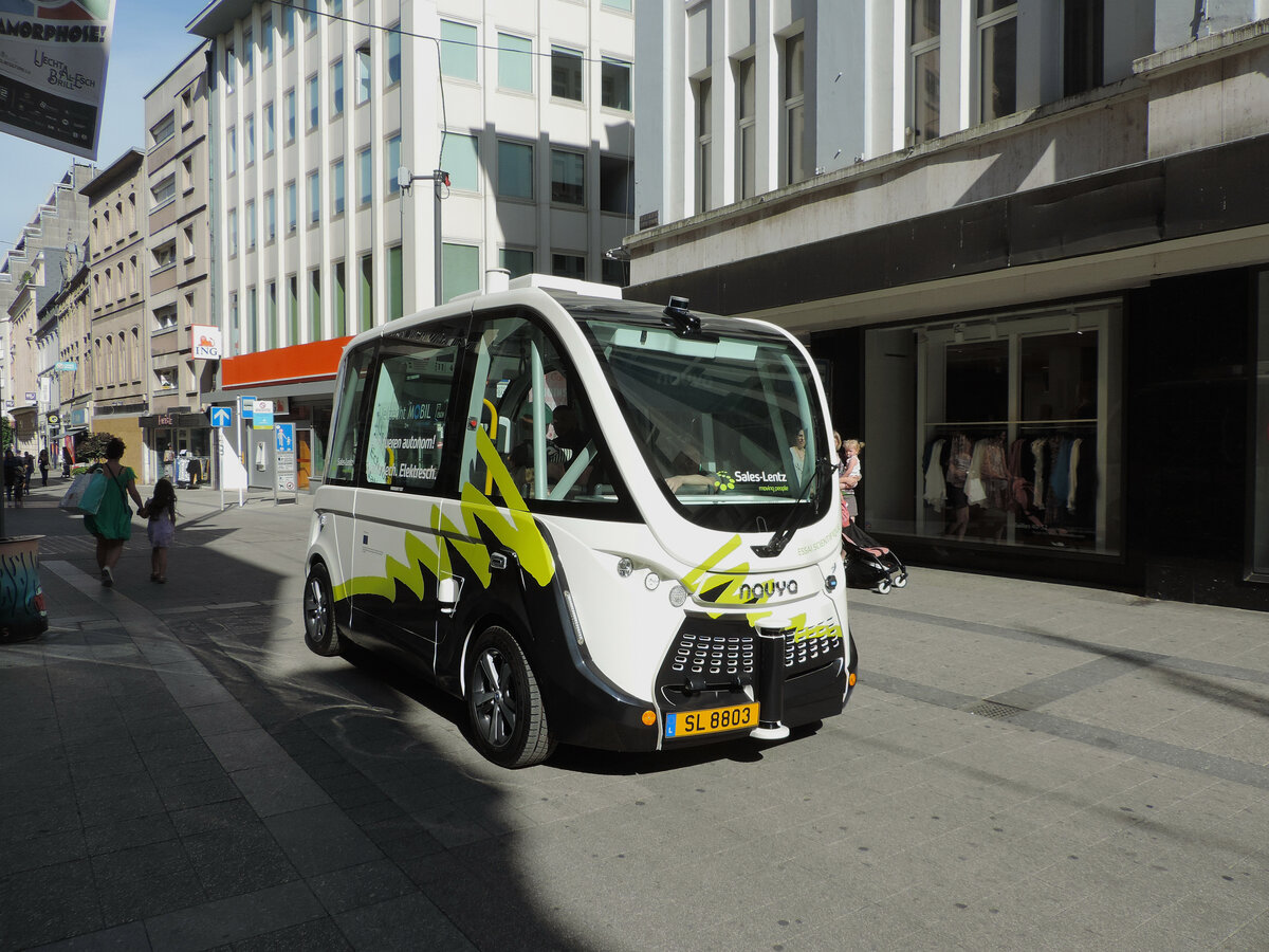 Esch sur Alzette - 30. Juli 2022 : Navya Kleinbus als autonomer Shuttlebus im Test in der Fussgängerzone. Er gehört am Unternehmen Sales Lentz.