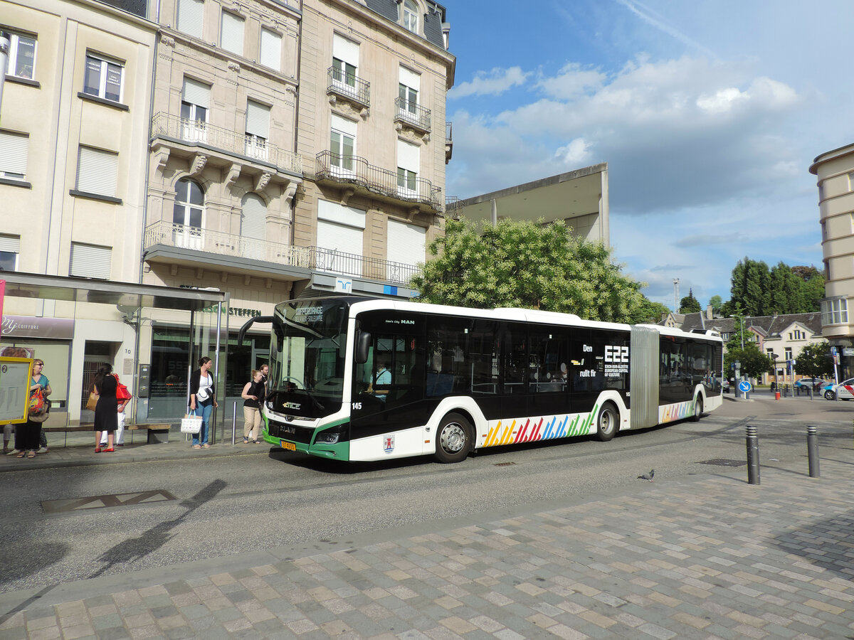 Esch sur Alzette - 30. Juli 2022 : New Lion's City 18 Hybrid Nr 145 auf der Linie 2 im Einsatz.