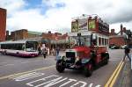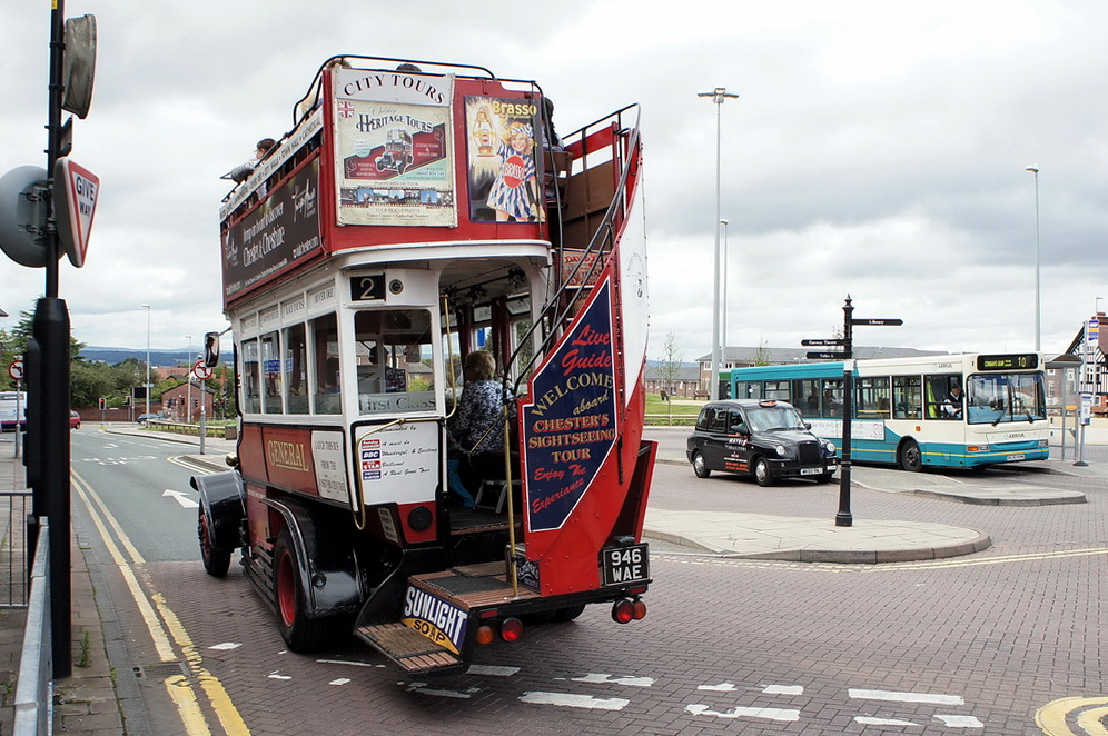Chester - Grafschaft Cheshire, Nordwestengland. Die historische Hauptstadt der Grafschaft hat auch einen historischen Buss aus dem Jahr 1910. Hier handelt es sich aber um einen Nachbau von 1964, der aber viel mehr Aufmerksamkeit auf sich zieht, als der moderne Stadtbuss links im Bild. 13.8.2011 Jürgen Walter