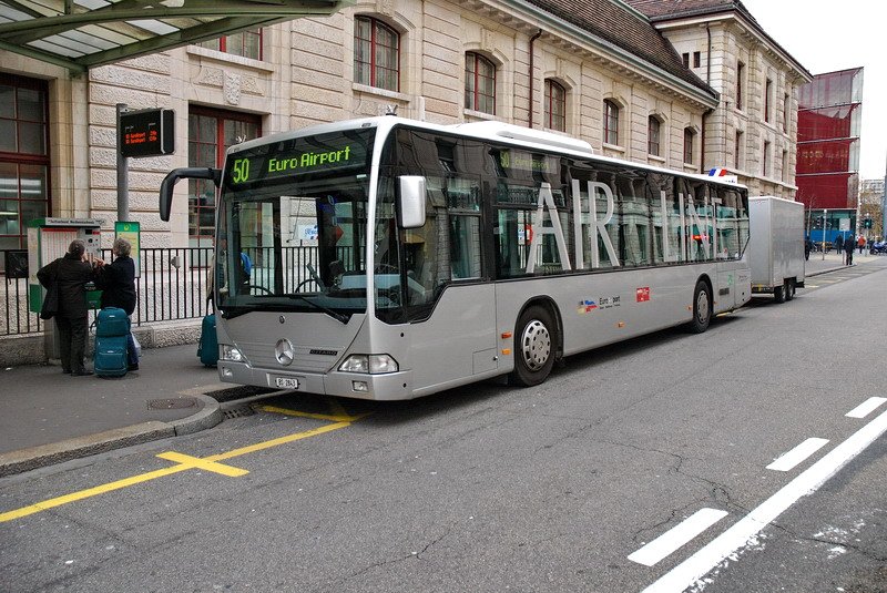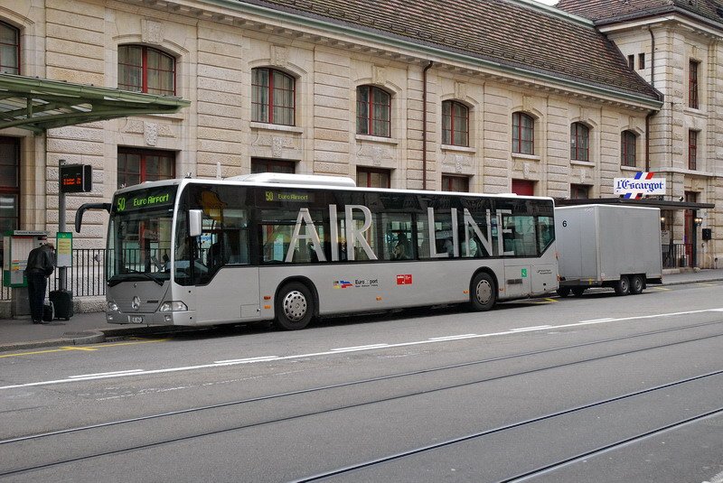 BS 2843 - Der schicke Mercedes Zubringerbus zum EuroAirport wartet am Bahnhof SBB/CFF auf Flugreisende. Die dürfen ruhig viel Gepäck mitbringen, denn der Anhänger ist ja groß genug. 11.12.2006 Jürgen Walter