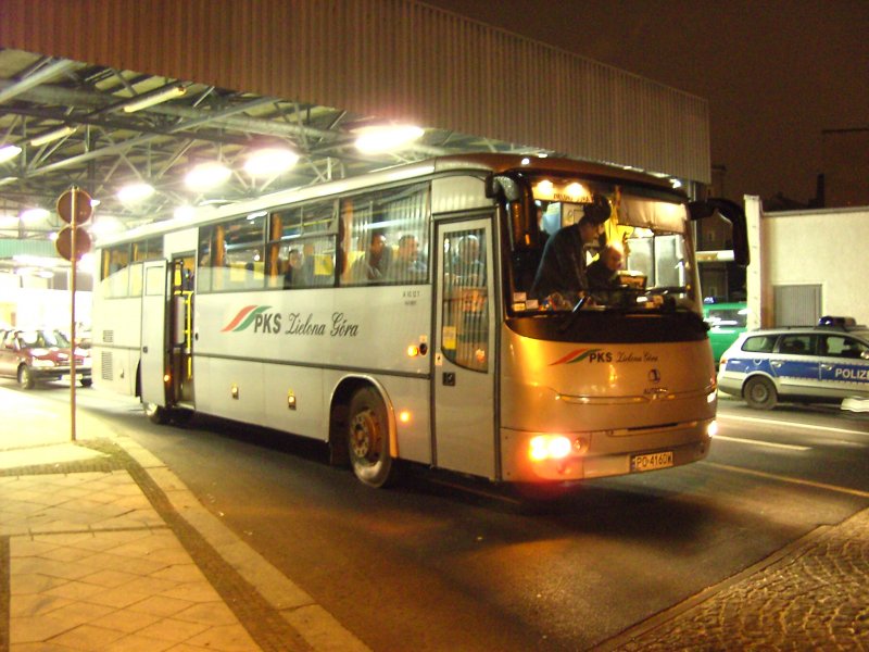 Bus der Eröffnung einer deutsch-polnischen Buslinie, am Steuer ein prominenter Landespolitiker von Berlin/Brandenburg. Der Bus steht im Bereich der ehem. Güst Frank Gutschmidt