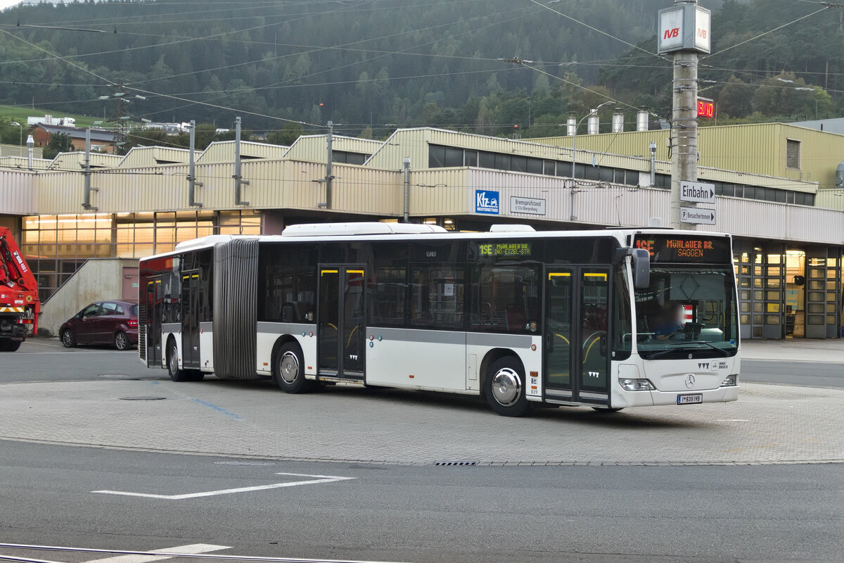 Innsbruck: Schienenersatzverkehr für die Straßenbahnlinie 1 wendet planmäßig im Betriebshof. Mercedes-Benz Citaro Facelift der Innsbrucker Verkehrsbetriebe (Bus Nr. 839). Aufgenommen 3.10.2023. stbtram