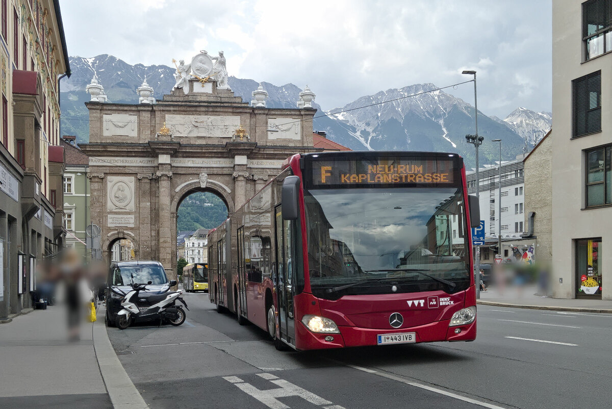 Mercedes-Benz Citaro 2. Generation der Innsbrucker Verkehrsbetriebe (Bus Nr. 443) als Linie F bei der Haltestelle Innsbruck Triumphpforte. Aufgenommen 1.6.2023. stbtram