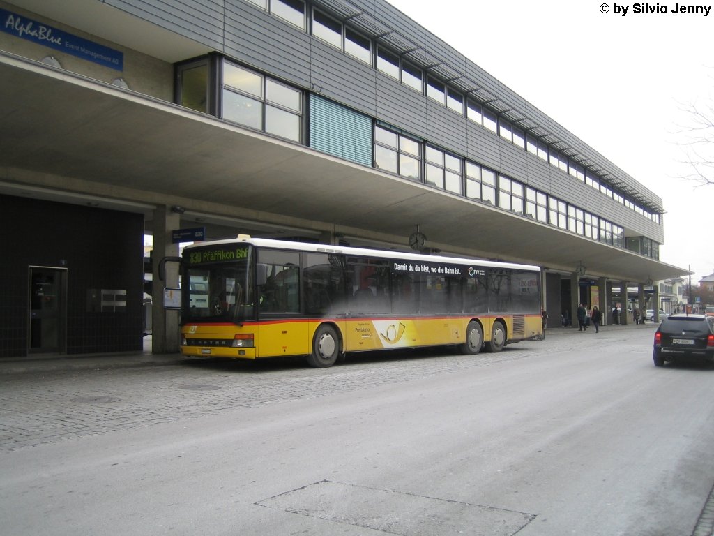 Postauto/PU Ryffel Nr. 057 (Setra S319NF) am 17.12.09 beim Bhf. Uster. Obwohl sich die Setras nicht sehr gut für Dachwerbung eignen, erhielt die der Nr. 057 eine ZVV-Werbung des aktuellen Slogans: ''Damit du da bist...'' Silvio Jenny