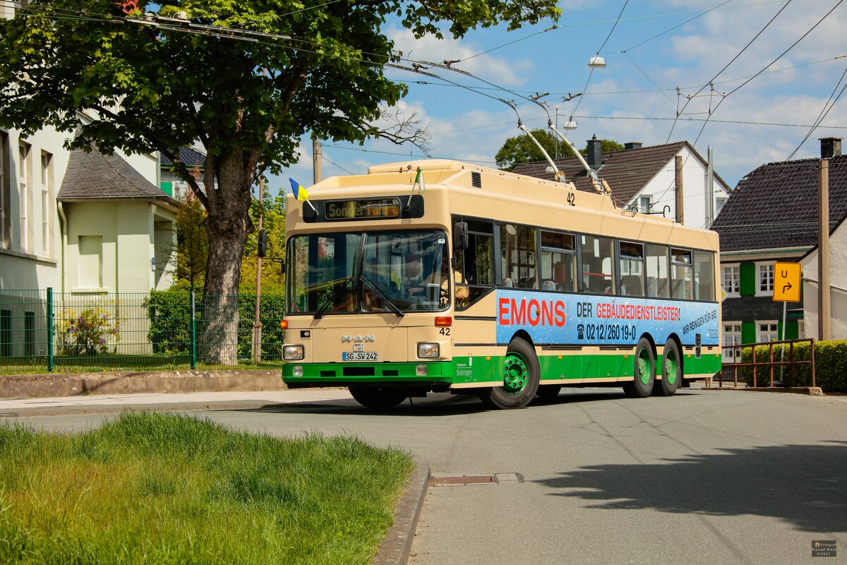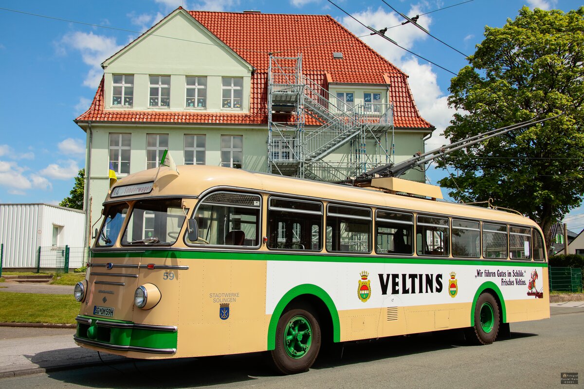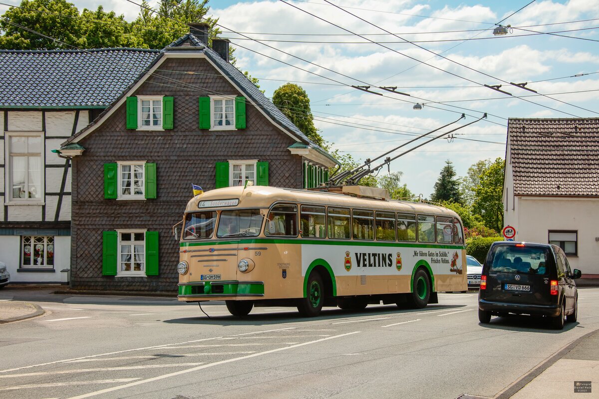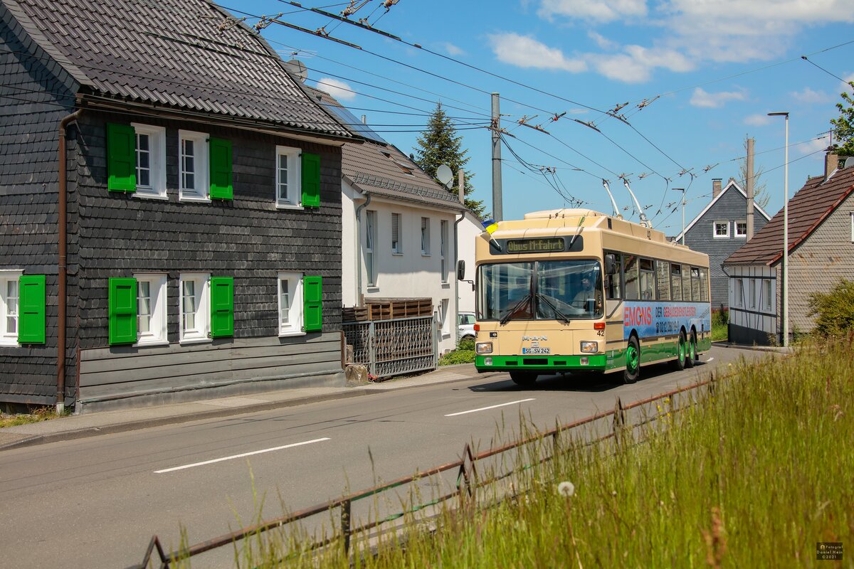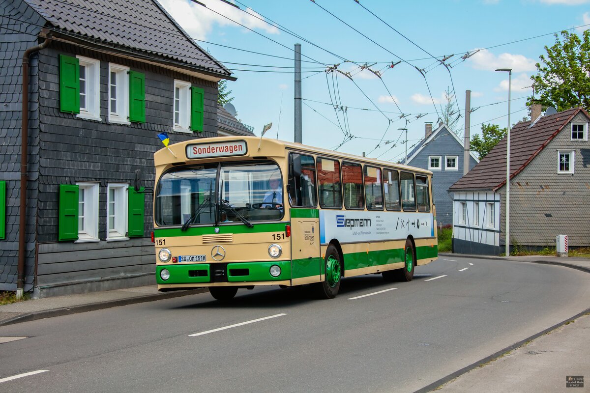 Am 13. Juni 2021 fuhr der Stadwerke Solingen Werbewagen 756 auf der Linie 681 nach Solingen-Hästen über die Kreuzung an der Haltestelle Mangenberg. Benedict Klunte