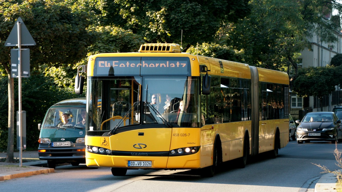Ein Solaris der Linie 64 in der  auf der Fahrt zum Fetscherplatz über die Waldschlößchenbrücke.Am  27.09.2013  17:28 Uhr in der Hechtstraße aufgenommen.
