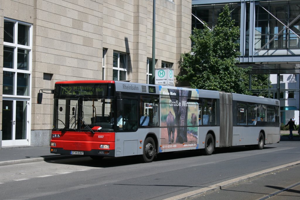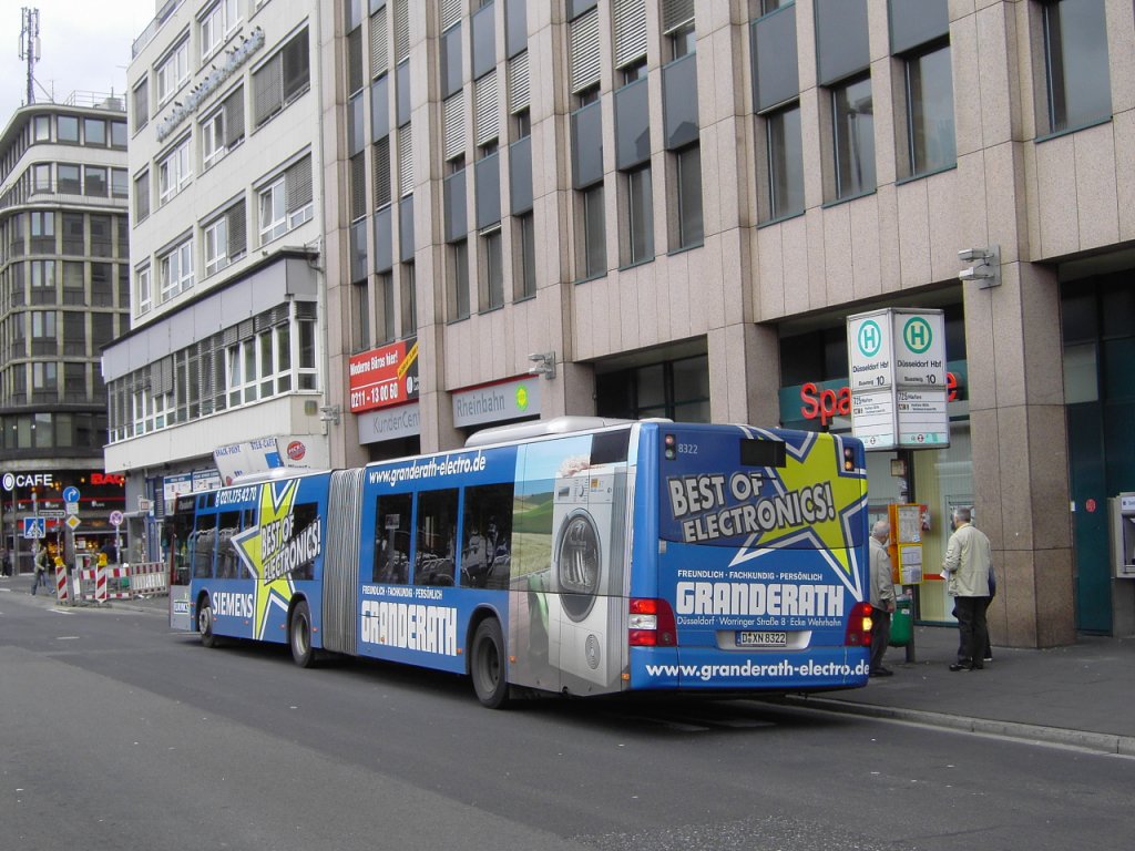 MAN NG 323 (Wagennummer 8322, Kfz-Kennzeichen D-XN 8322, Baujahr 2008) der Rheinbahn AG Düsseldorf. Der Bus ist im Einsatz als Linie 834, zwischen Düsseldorf-Oberkassel, Belsenplatz und Düsseldorf Hauptbahnhof.