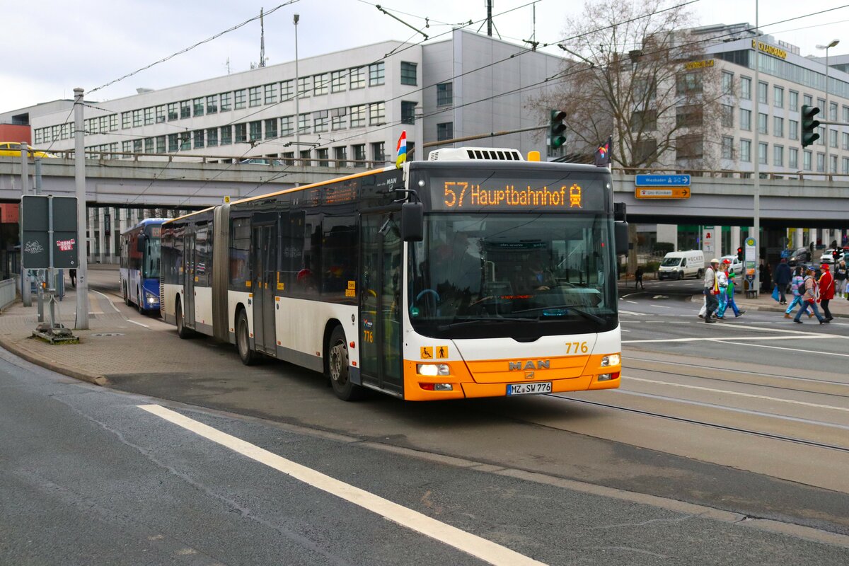 Mainzer Mobilität MAN Lions City G Wagen 755 am 12.02.24 in Mainz Hauptbahnhof
