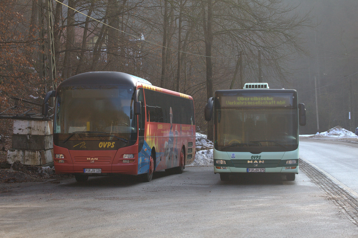 Sonntags abgestellte MAN Busse der OVPS in den typischen Farben, auf dem Parkplatz am Straßenbahnhof der Kirnitzschtalbahn. 19.02.2017 09:58 Uhr. Siegfried Heße