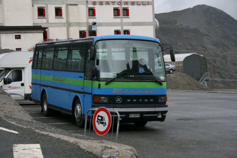 Setra 210H (SO202070) von Perego, Tirano, am 4.8.2007 auf dem Stilfserjoch. Drei Mal täglich fährt der kleine Setra von Bormio über die schmale und steile Strasse auf die Passhöhe, wo, je nach Tag und Zeit, Anschluss mit PostAuto ins Münstertal und mit dem SAD nach Mals besteht. Jonas Schaufelberger