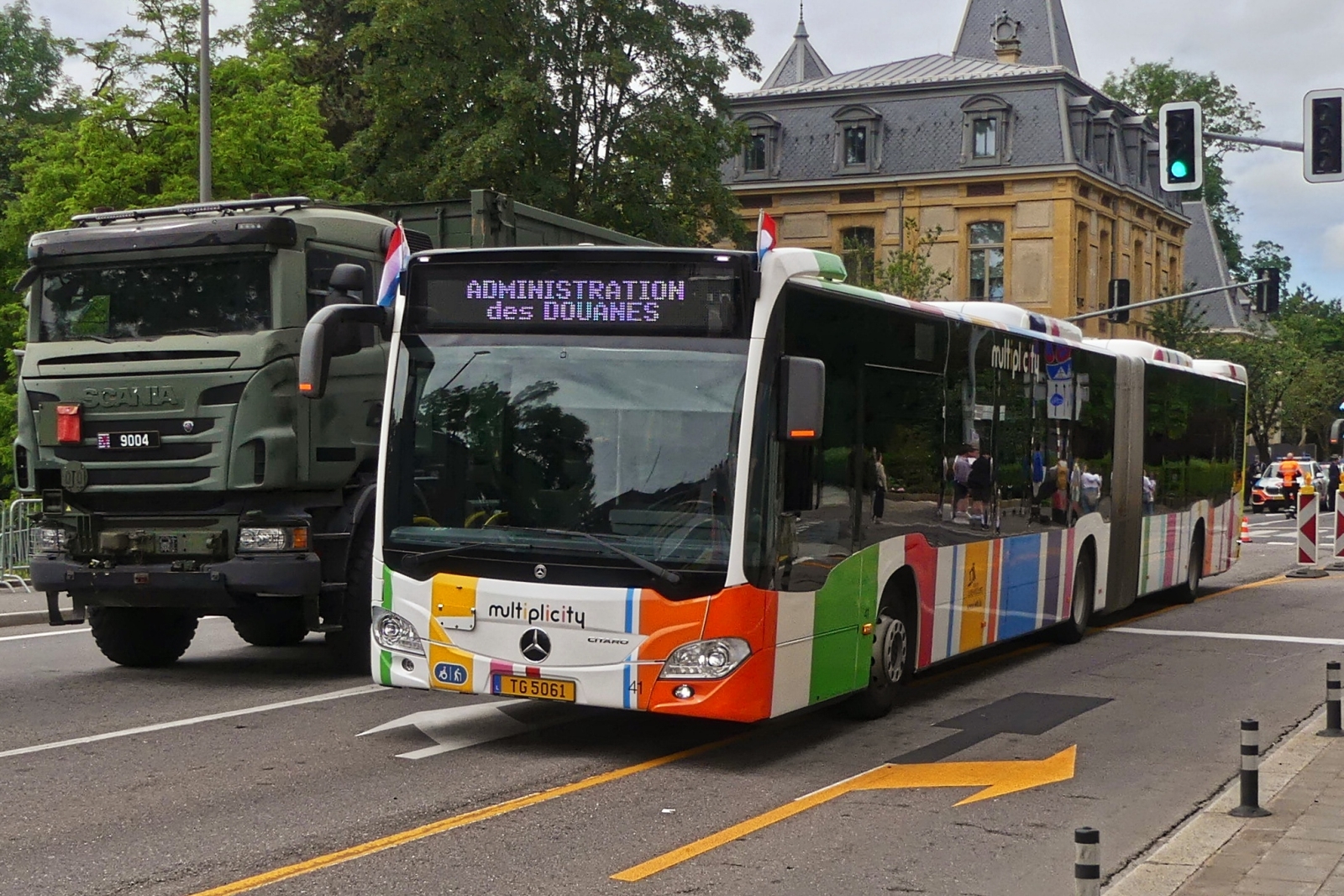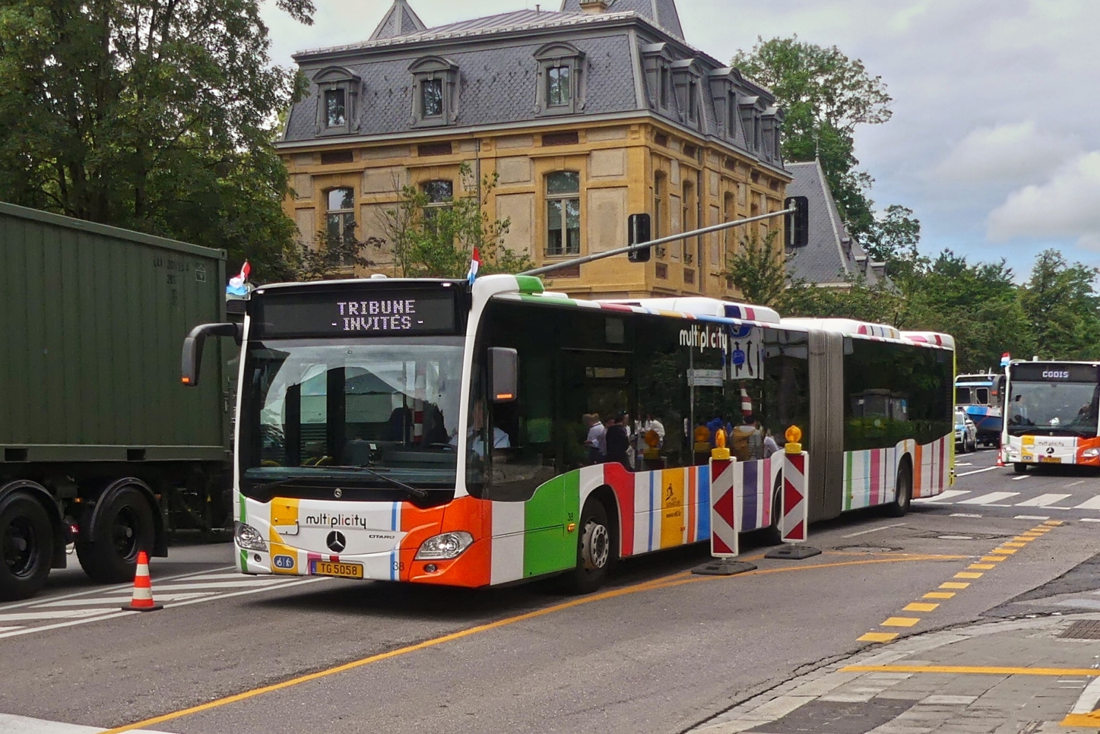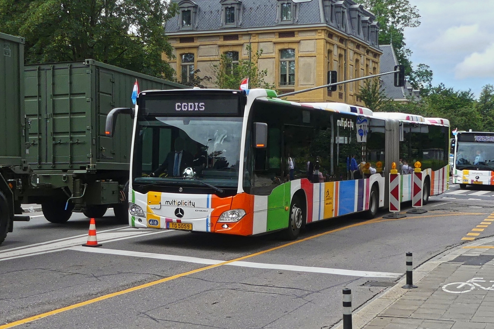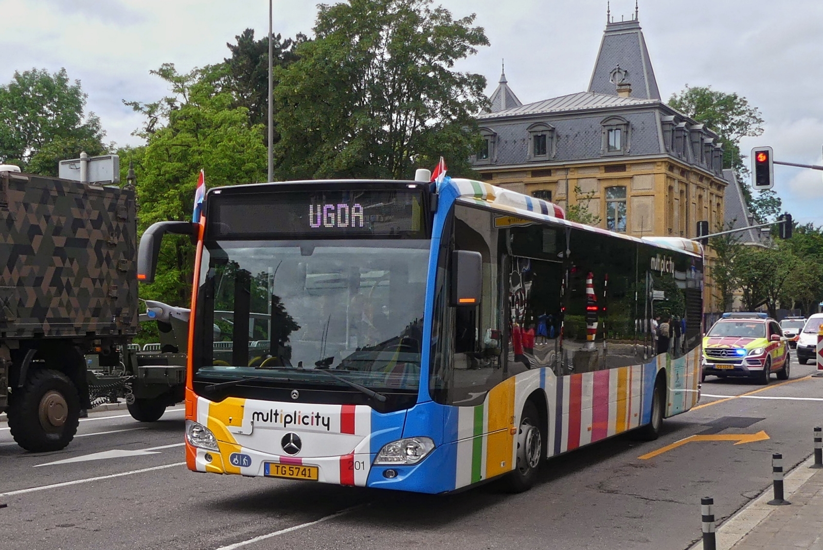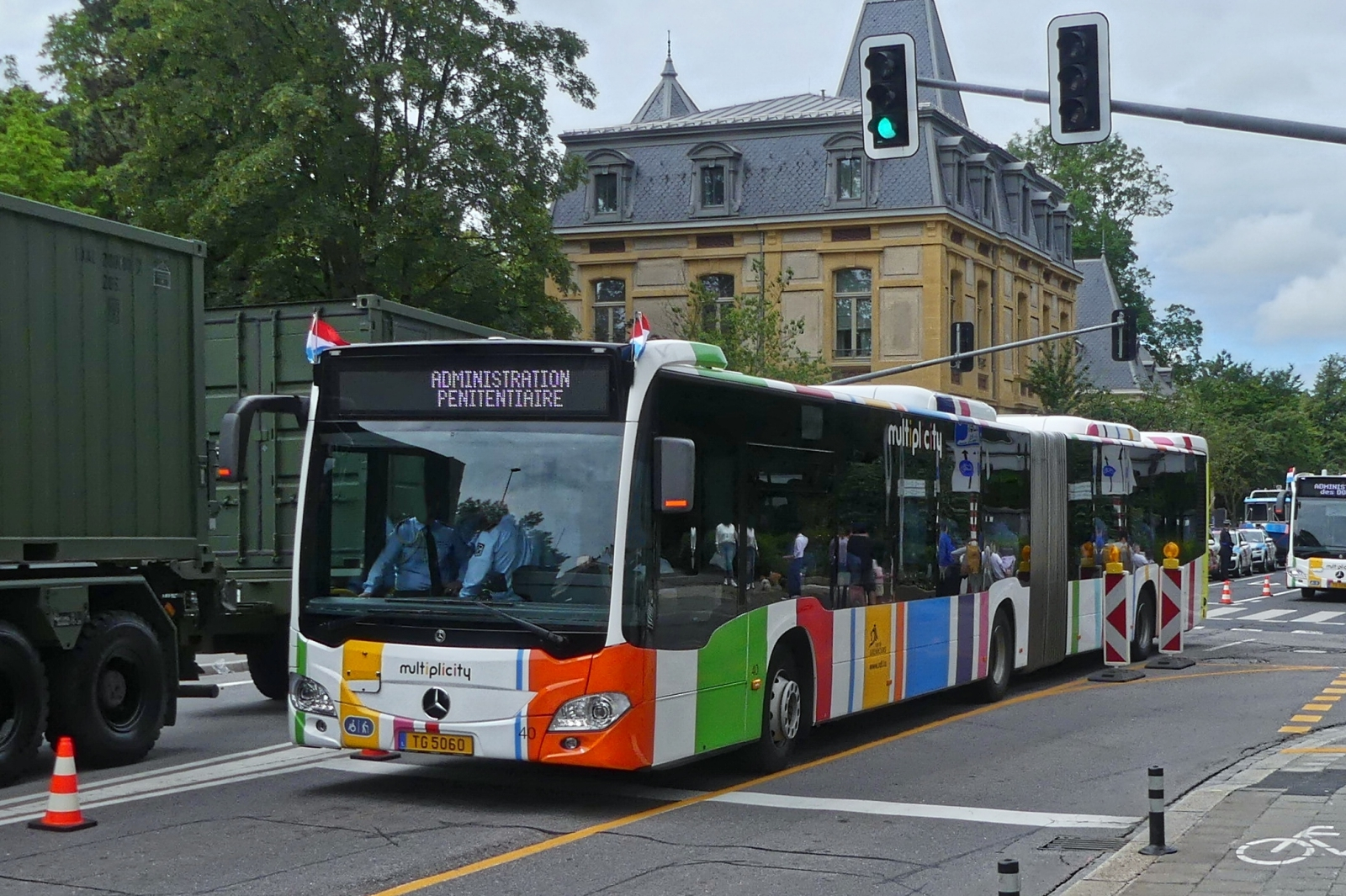 TG 5060, Mercedes Benz Citaro vom VDL, auf dem weg mit Geladenen Gästen zum Aufstellungsort der Vereine, um an der Militärparade in der Stadt Luxemburg anlässlich des Nationalfeiertags mitzugehen. 23.06.2024 De Rond Hans und Jeanny
