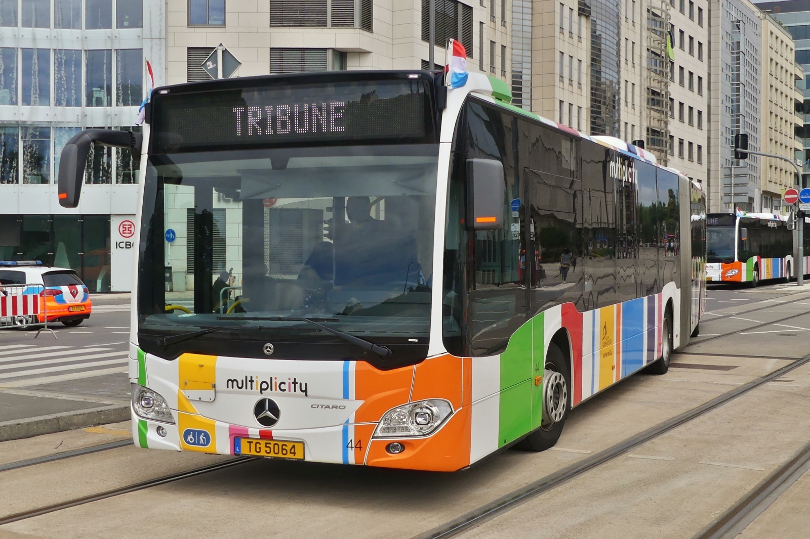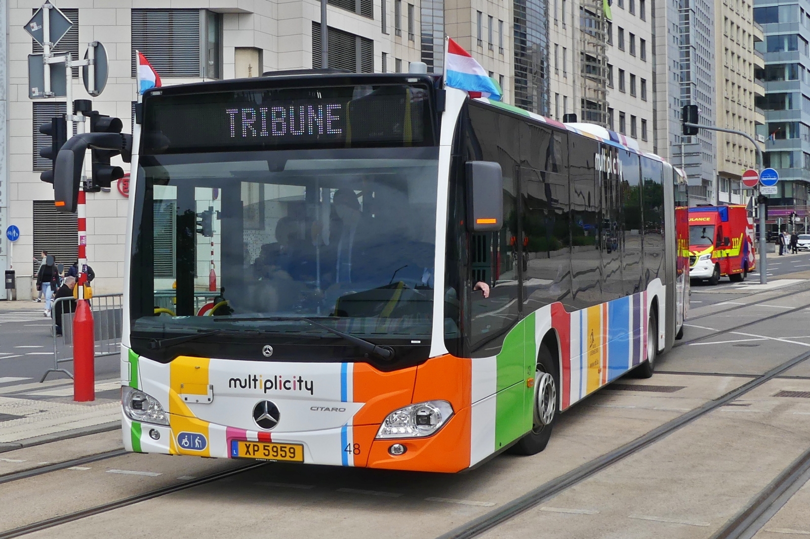 TG 5059, Mercedes Benz Citaro vom VDL, am Nationalfeiertag mit der Gruppe des CGDIS, (Luxemburgische Rettungswesen), in der Stadt Luxemburg unterwegs. 23.06.2024 De Rond Hans und Jeanny