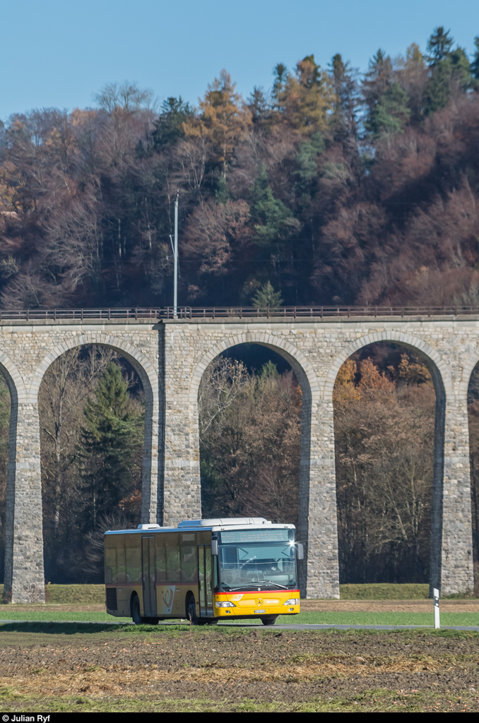 PAG Solaris Midibus am 20. November 2016 auf der Linie 550 von Gümmenen nach Laupen. Die Linie ersetzt auf diesem Abschnitt seit 1993 die Sensetalbahn. Julian Ryf
