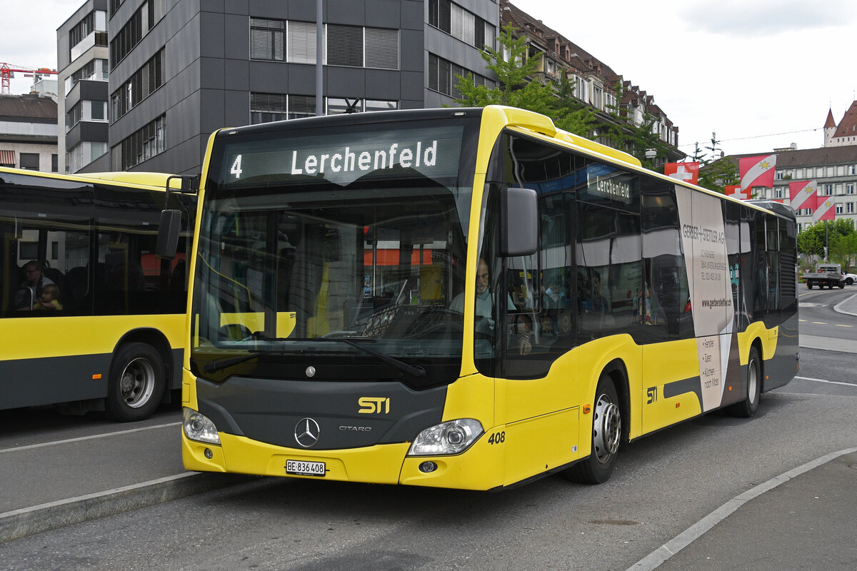 Mercedes Citaro 408 der STI, auf der Linie 4, verlässt am 30.07.2025 die Haltestelle beim Bahnhof Thun.