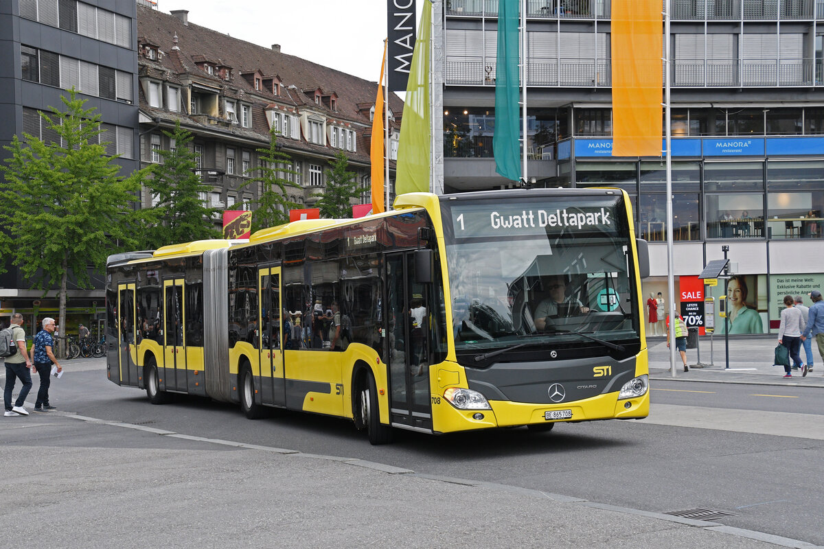 Mercedes Citaro 183 der STI, auf der Linie 5, verlässt am 10.08.2023 die Haltestelle beim Bahnhof Thun.