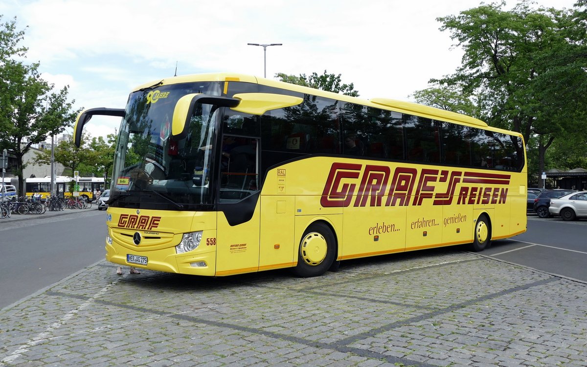 Mercedes-Benz MB Tourismo, #558, der Anton Graf GmbH Reisen & Spedition ''Graf's Reisen'', Berlin/Hardenbergplatz im Juli 2020.