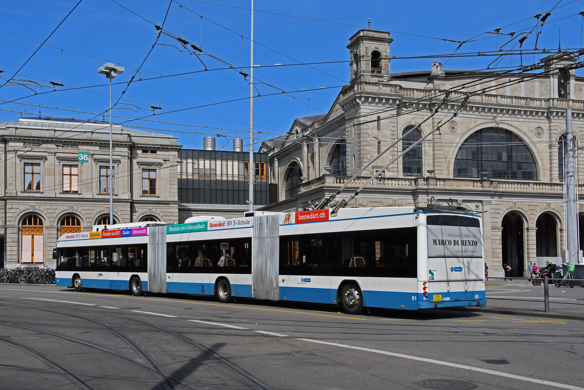 Hess Doppelgelenk Trolleybus 61, auf der Linie 31, fährt am 22.08.2024 zur Haltestelle beim Bahnhofplatz in Zürich.