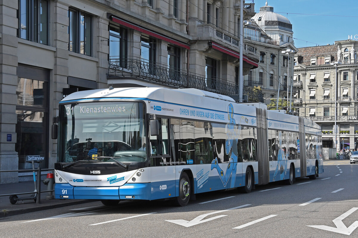 Hess Doppelgelenk Trolleybus 91, auf der Linie 31, fährt am 22.08.2024 zur Haltestelle Central. Aufnahme Zürich.