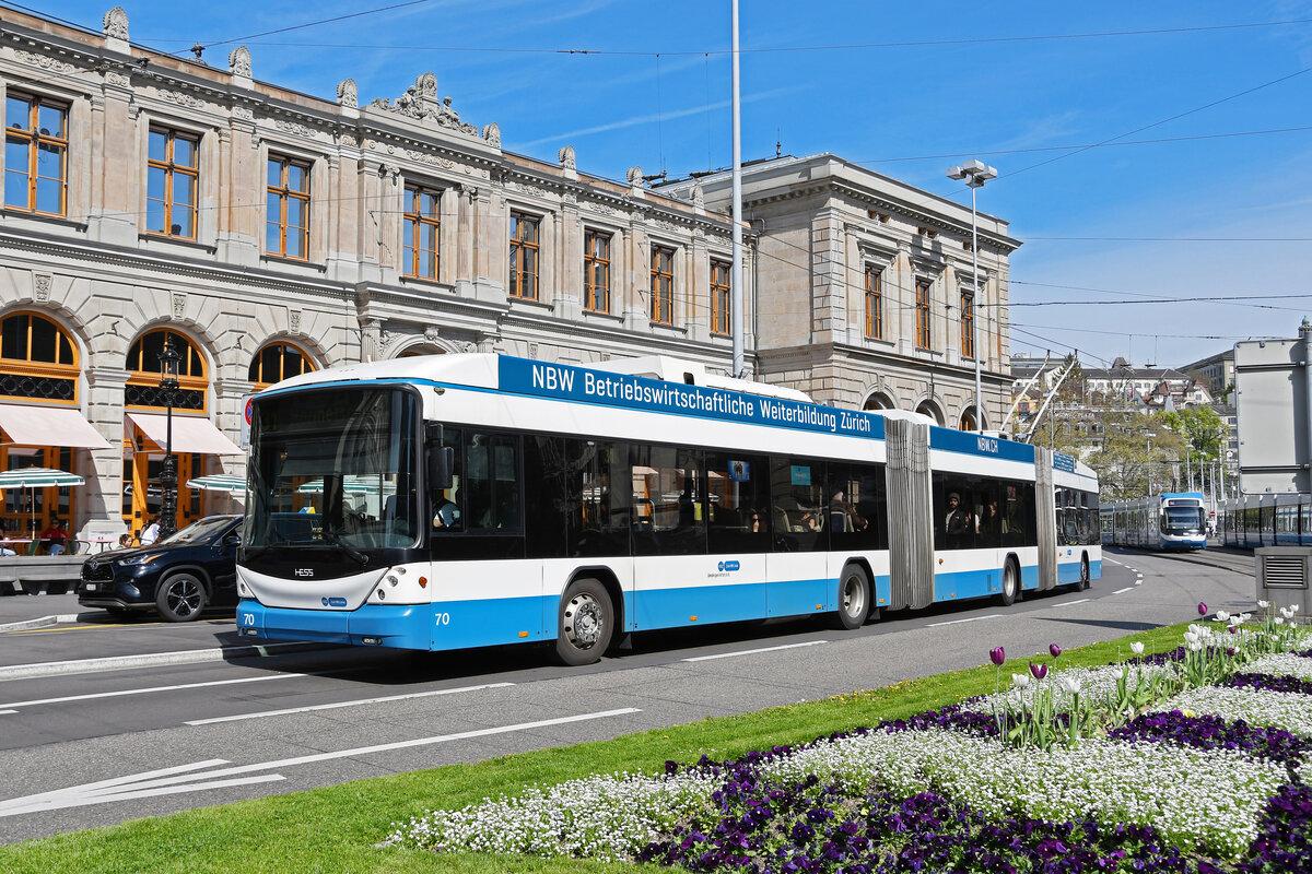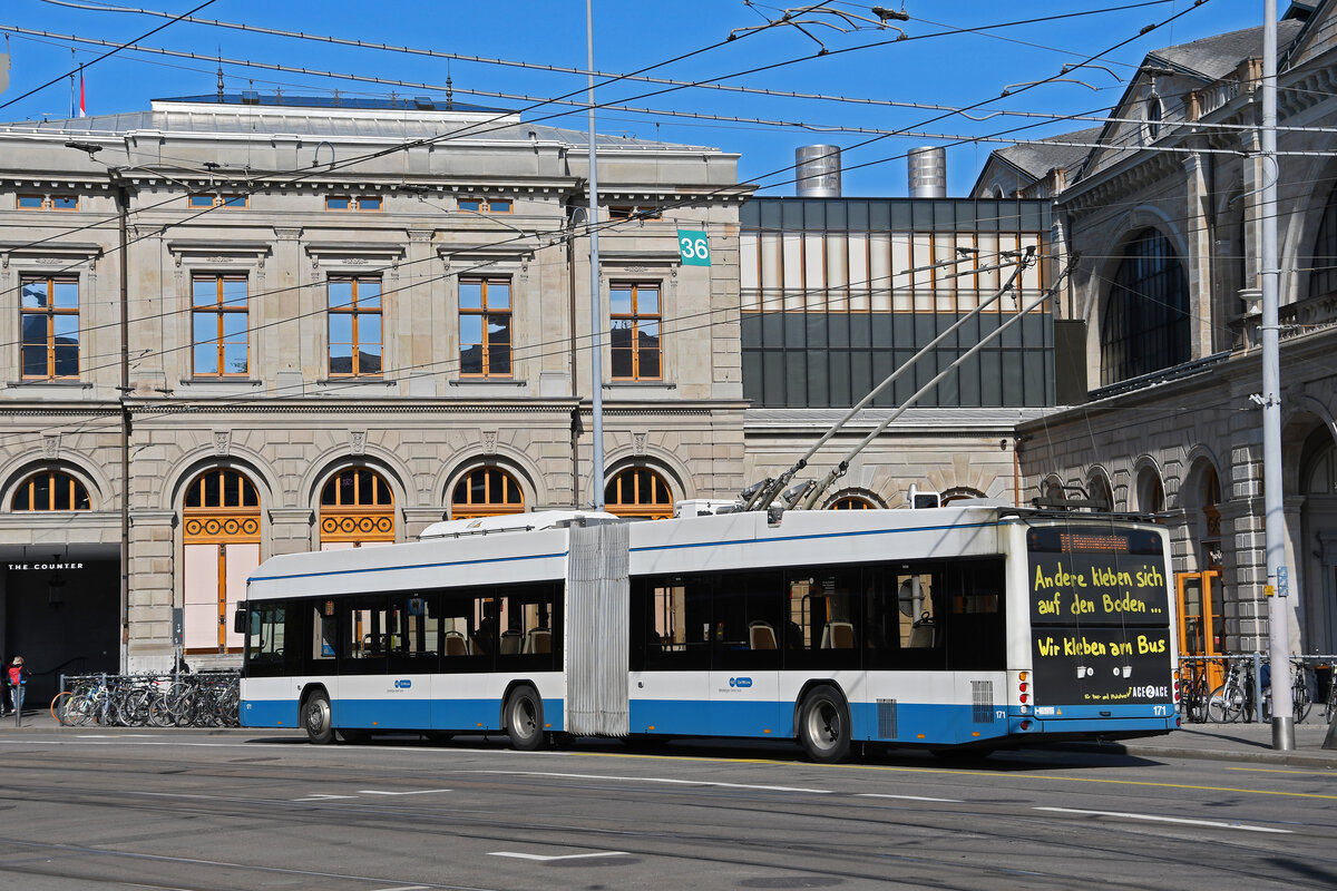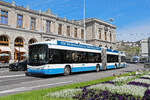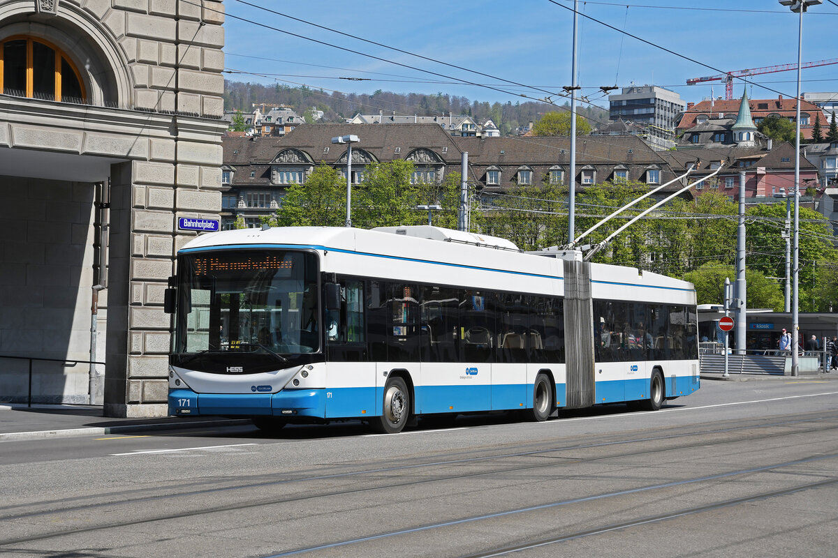Hess Doppelgelenk Trolleybus 87, auf der Linie 31, fährt am 12.04.2024 zur Haltestelle beim Bahnhofplatz in Zürich.