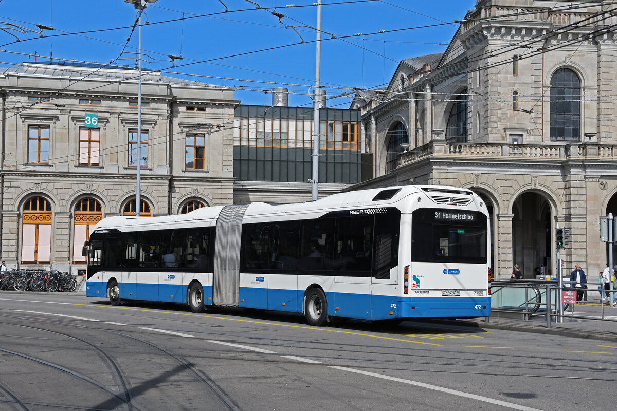 Volvo Hybridbus 472, auf der Linie 31, fährt am 22.08.2024 zur Haltestelle beim Bahnhofplatz in Zürich.