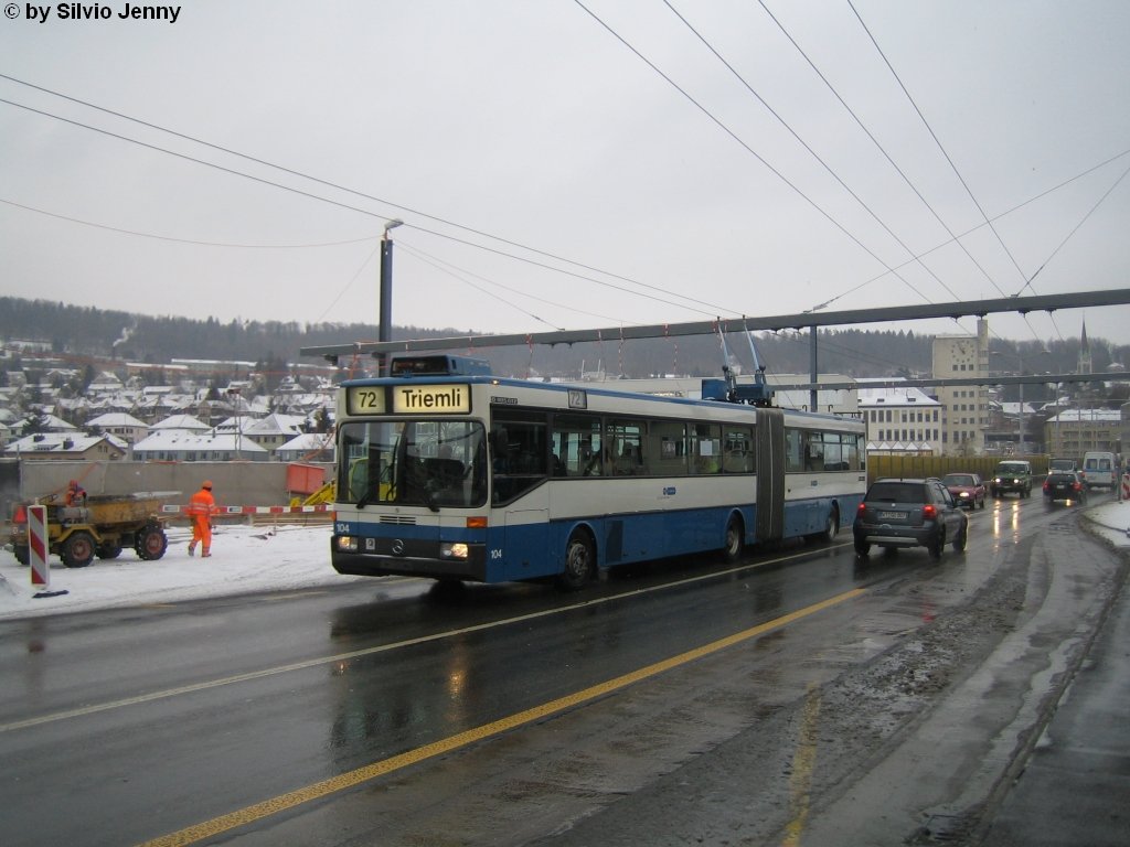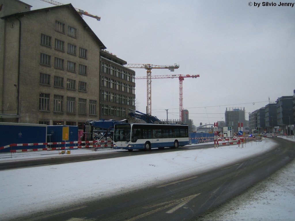 VBZ Nr. 104 (Mercedes O405GTZ) am 28.1.2010 bei der Haltestelle Escher-Wyss-Platz, die wegen der Hardbrücke-Baustelle durch Schlangenlinien fahren doch noch erreicht werden kann. Silvio Jenny