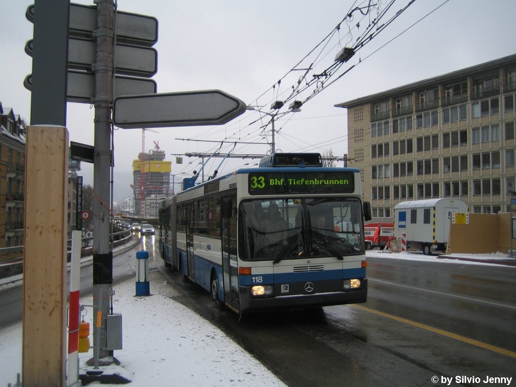VBZ Nr. 118 (Mercedes O405GTZ) am 28.1.10 beim Escher-Wyss-Platz. Gerüchten zufolge sollen im Jahre 2014 auch die 2. Serie der GTZ ersetzt werden. Silvio Jenny