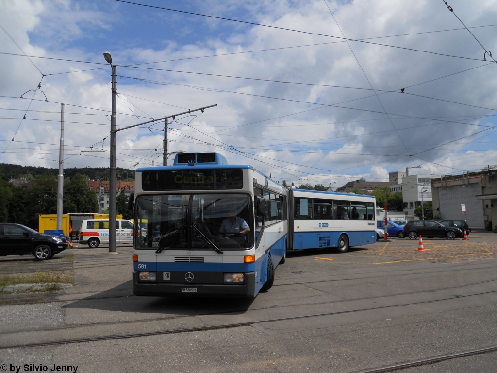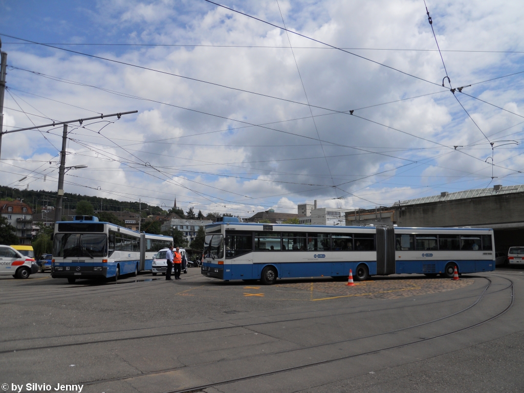 VBZ Nr. 590 + 591 (Mercedes O405G) am 30.7.2010 beum Depot Escher-Wyss Platz. Während den Tramersatzfahrten steht hinter dem Depot Hard noch ein Dispobus zu Verfügung, weil aber auf der Linie 4 und 13 noch weitere O405G unterwegs sind, kommt es ab und an mal zu einem Treffen der ''Oldies''. Silvio Jenny