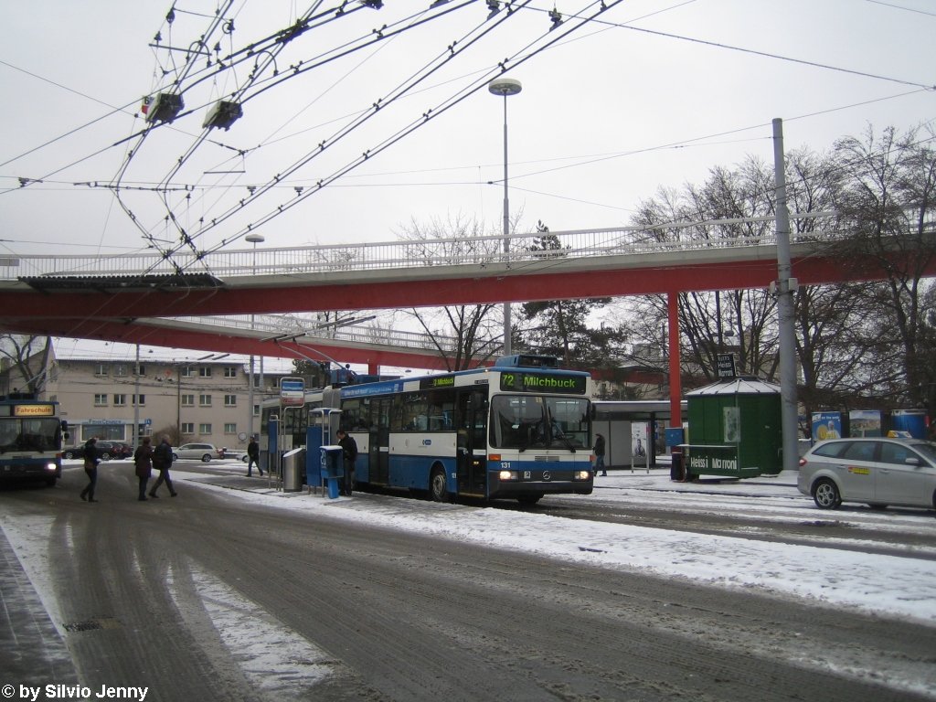 VBZ Nr. 131 (Mercedes O405GTZ) am 28.1.2010 beim Bucheggplatz. Links vom Bild ist noch knapp der Fahrschulwagen, einem 1. Serien GTZ zu erkennen. Silvio Jenny
