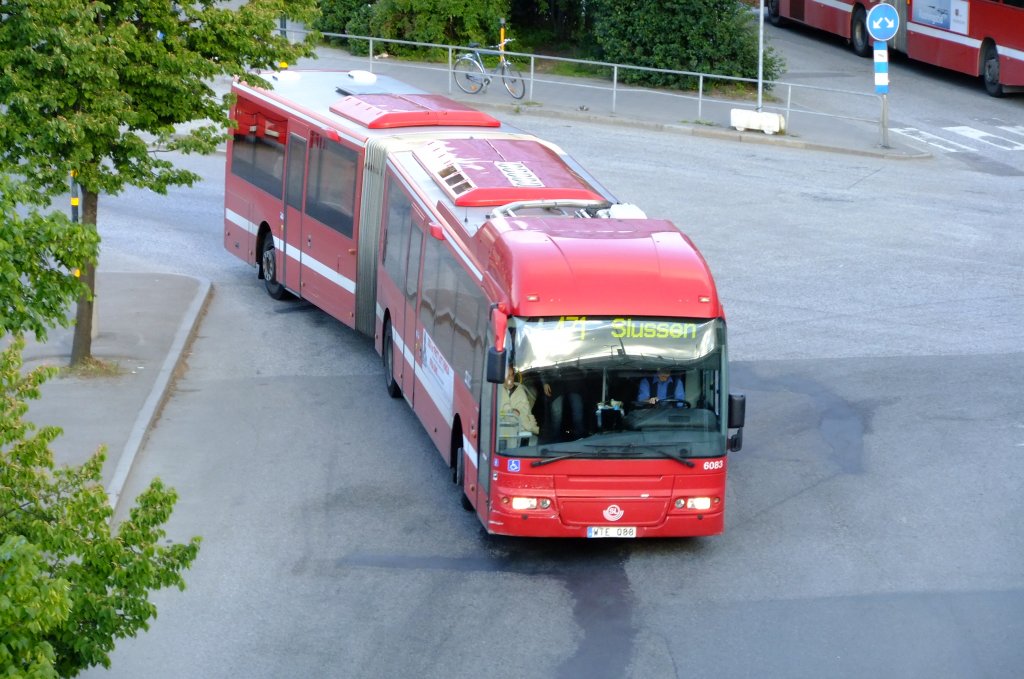 Auf den längeren Linien kommen die roten Wagen zum Einsatz, so auch dieser bereits etwas ältere Gelenkbus Typ Volvo 8500, aufgenommen am 15.6.2010 am Slussen. Jonas Schaufelberger