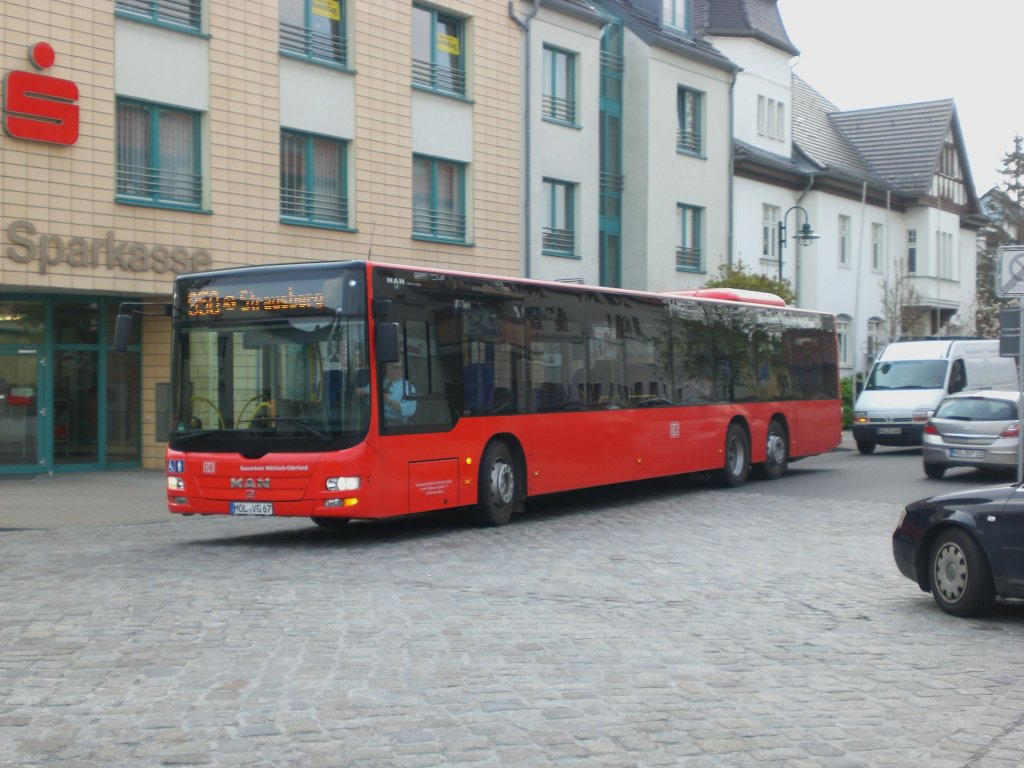 MAN Niederflurbus 3. Generation (Lions City Ü/TÜ) auf der Linie 950 nach S-Bahnhof Strausberg an der Haltestelle Rüdersdorf Marktplatz.