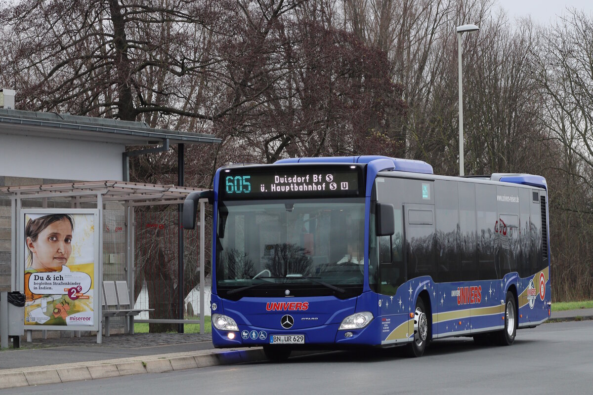 Wagen 29 von Univers Reisen im Auftrag der SWB auf der 605, die bis zum Fahrplanwechsel im Dezember '24 noch bis Graurheindorf, Mondorfer Fähre fuhr Berzan Ali