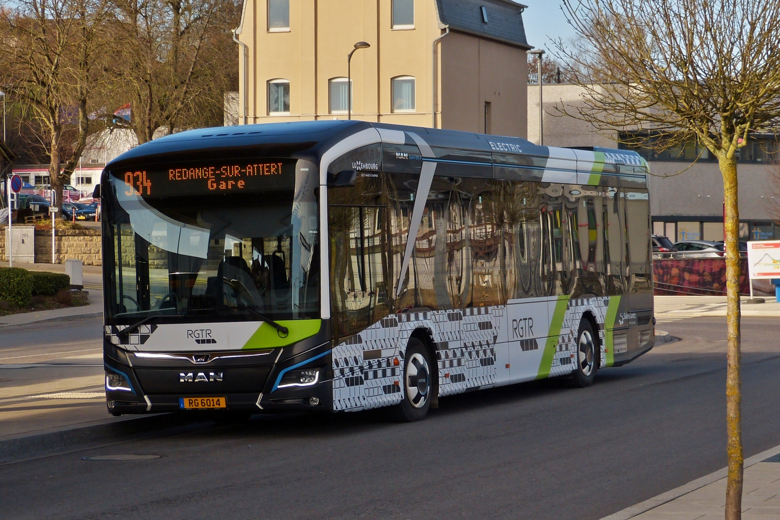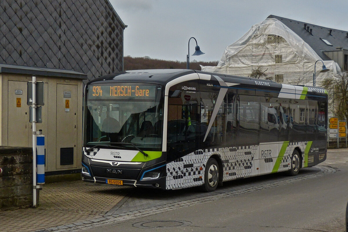 RG 6004, MAN Lions Citye, von Slaes Lentz, steht an der Haltestelle Redange sur Attert Gare bereit um die Linie 934 zum Bahnhof in Mersch zu bedienen. 03.2023 De Rond Hans und Jeanny