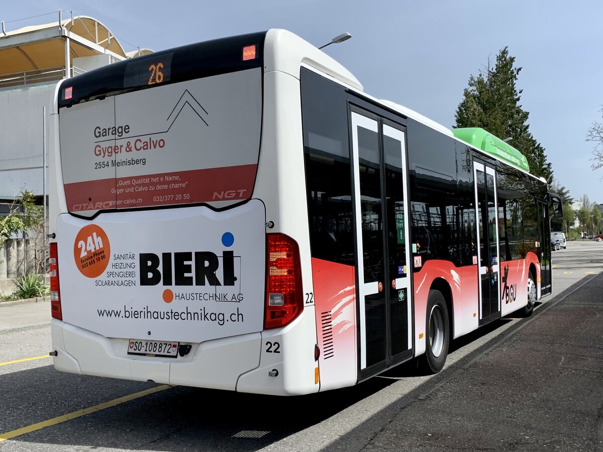 BGU - Mercedes Citaro Nr.22 SO 108872 bei den Haltestellen beim Bahnhof Grenchen Süd am 15.04.2022