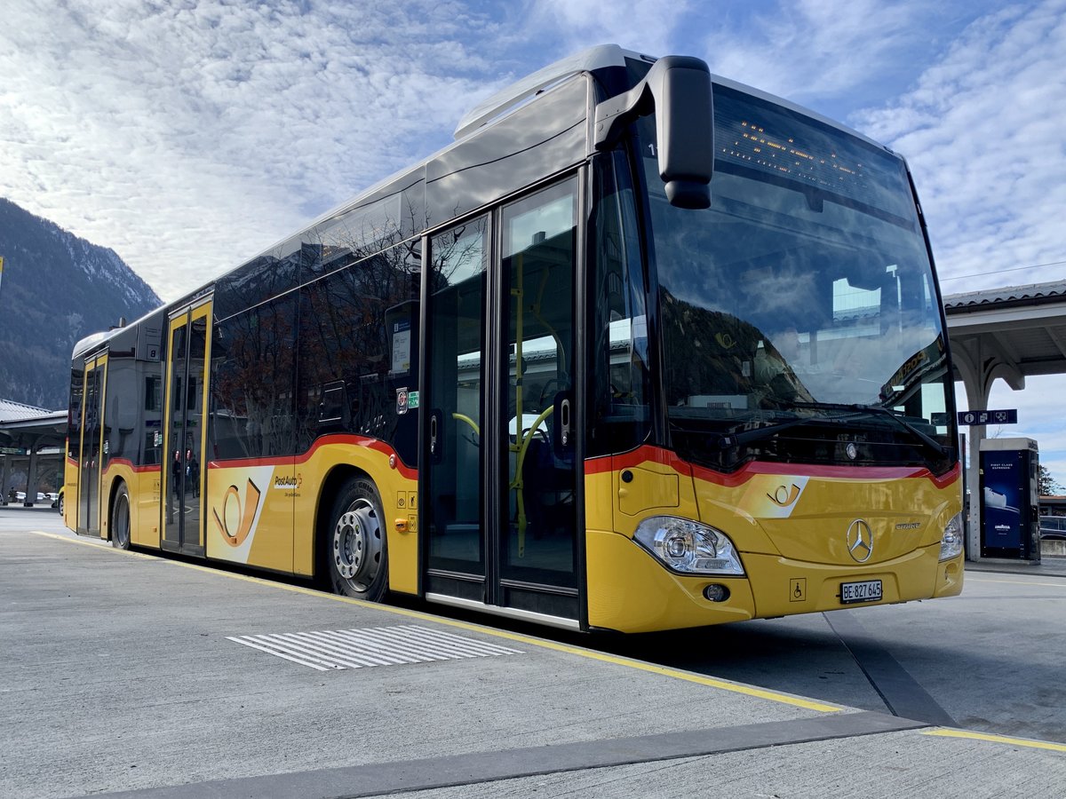 Heckansicht des neuen MB C2 hybrid '11426' "BE 827 645" von PostAuto Interlaken am 23.11.20 beim Bahnhof Interlaken West.