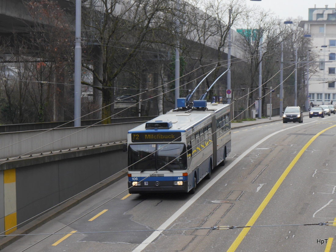 VBZ - Schnappschuss des Mercedes Trolleybus Nr.106 unterwegs auf der Linie 72 in der Stadt Zürich am 24.01.2015