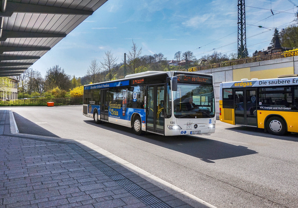 Ein Mercedes-Benz O 530 II (Nr. 135) der SÜC, fährt am 10.4.2017 in die Haltestelle Coburg Bahnhof/ZOB ein.