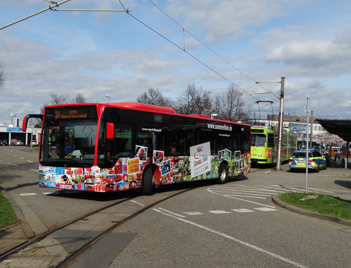 Freiburger VAG Mercedes Benz Citaro 1 Facelift Wagen 861 am 20.03.17 an der Haltestelle Haid