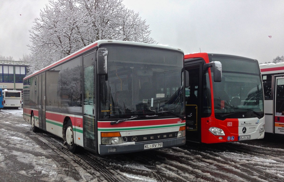 Der älteste und der neueste Saar-Pfalz-Bus der Betriebsstelle Kaiserslautern: Setra S315 NF Baujahr 1999 und Citaro C2 Ü Baujahr 2014 (KL-RV 791 und SB-RV 343) beim ersten Schnee 2014 in Kaiserslautern (03.12.2014)