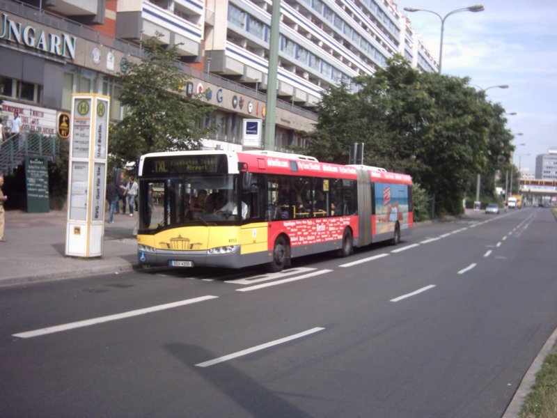 Wagen 4155 am 15.08.2007 auf der Linie TXL an der Haltestelle Spandauer Str./Marienkirche. Da die Umstellung der Linie auf Gelenkbusse sehr kurzfristig kam, ist man jetzt fleissig dabei, die Busse mit der vertraglichen Werbung zu bekleben.