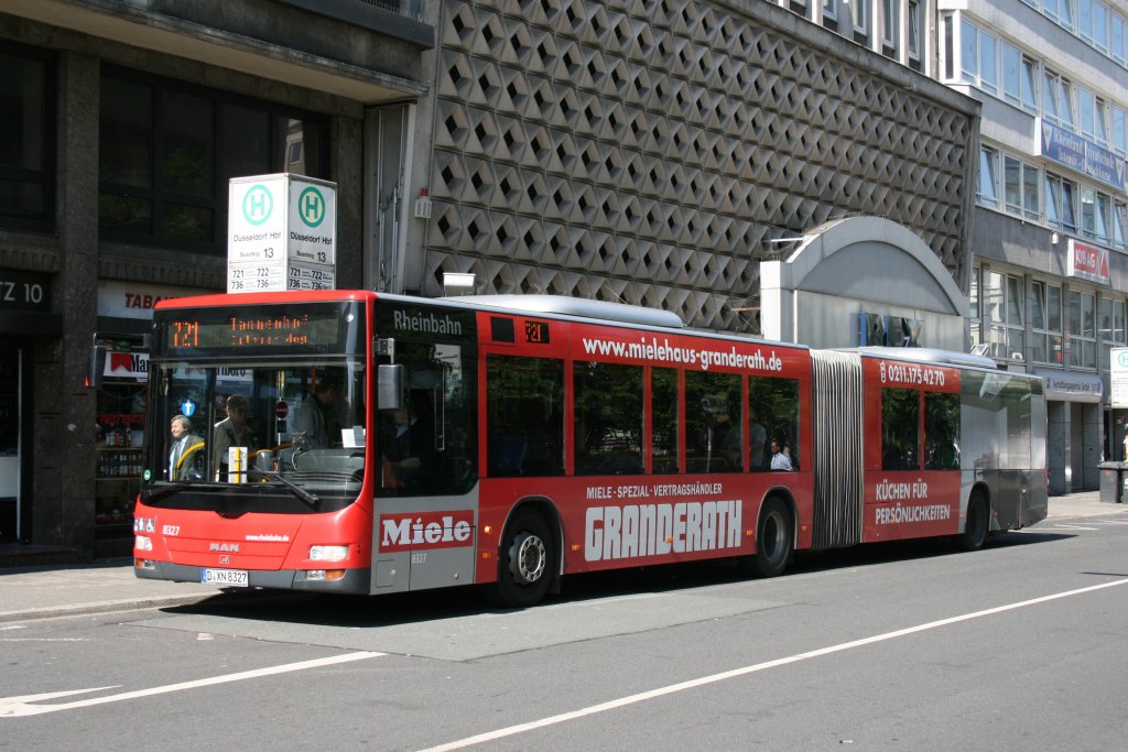 Rheinbahn 8327 (D XN 8327) macht Werbung für Granderath Küchen. Düsseldorf HBF, 2.6.2010
