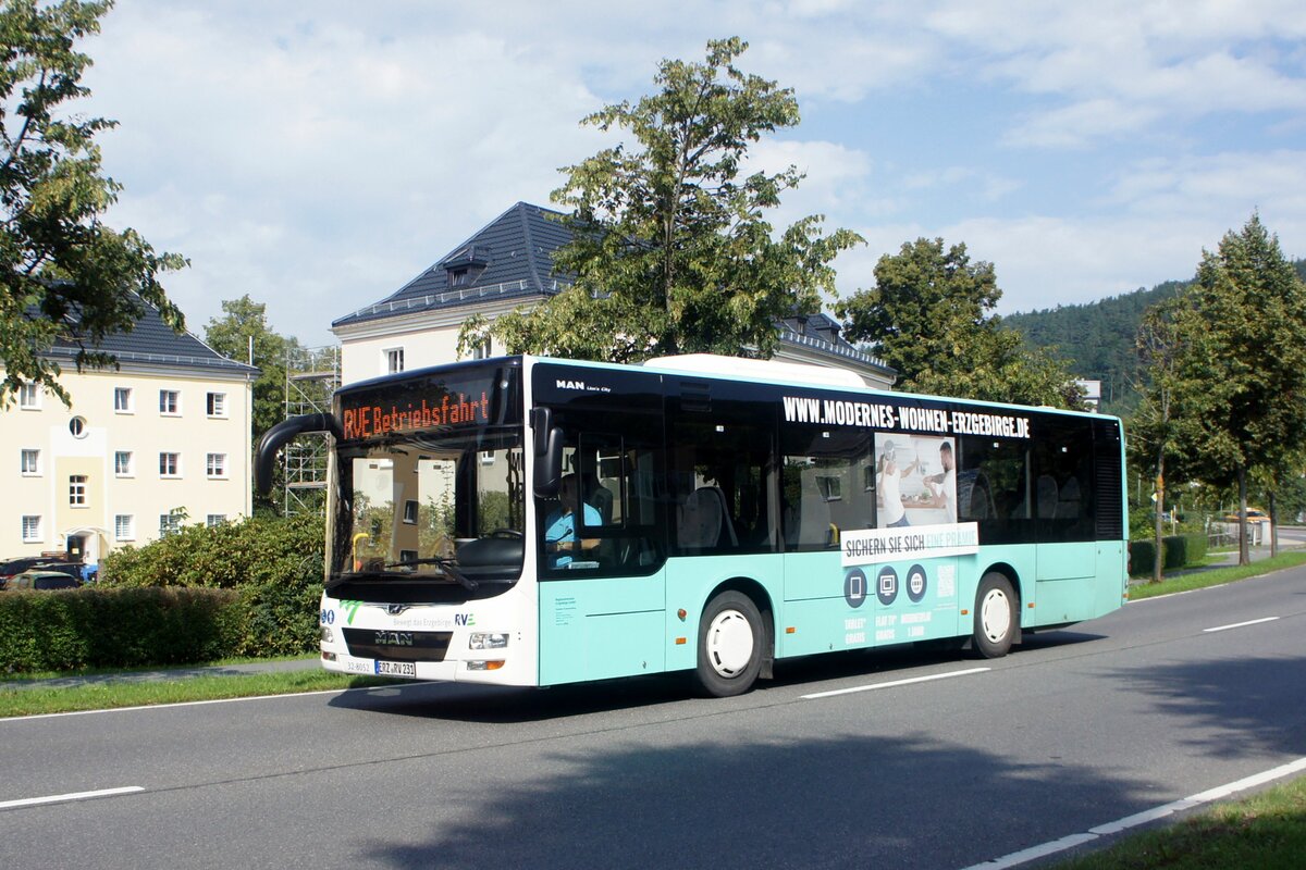 Bus Schwarzenberg / Bus Erzgebirge: MAN NÜ (ERZ-RV 390) der RVE (Regionalverkehr Erzgebirge GmbH), aufgenommen im August 2023 im Stadtgebiet von Schwarzenberg / Erzgebirge. N8Express