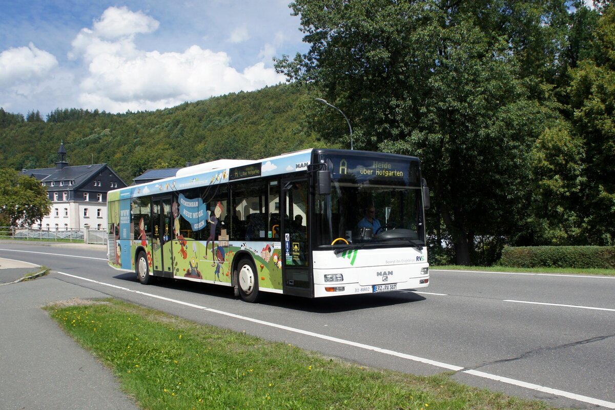 Stadtverkehr Schwarzenberg / Stadtbus Schwarzenberg / Bus Erzgebirge: MAN NÜ (ERZ-RV 387) der RVE (Regionalverkehr Erzgebirge GmbH), aufgenommen im August 2023 im Stadtgebiet von Schwarzenberg / Erzgebirge. N8Express