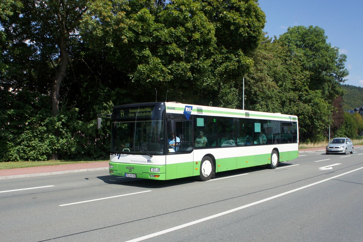 Stadtverkehr Schwarzenberg / Stadtbus Schwarzenberg / Bus Erzgebirge: MAN NÜ (ERZ-RV 114) der RVE (Regionalverkehr Erzgebirge GmbH), aufgenommen im Juli 2022 im Stadtgebiet von Schwarzenberg / Erzgebirge. N8Express