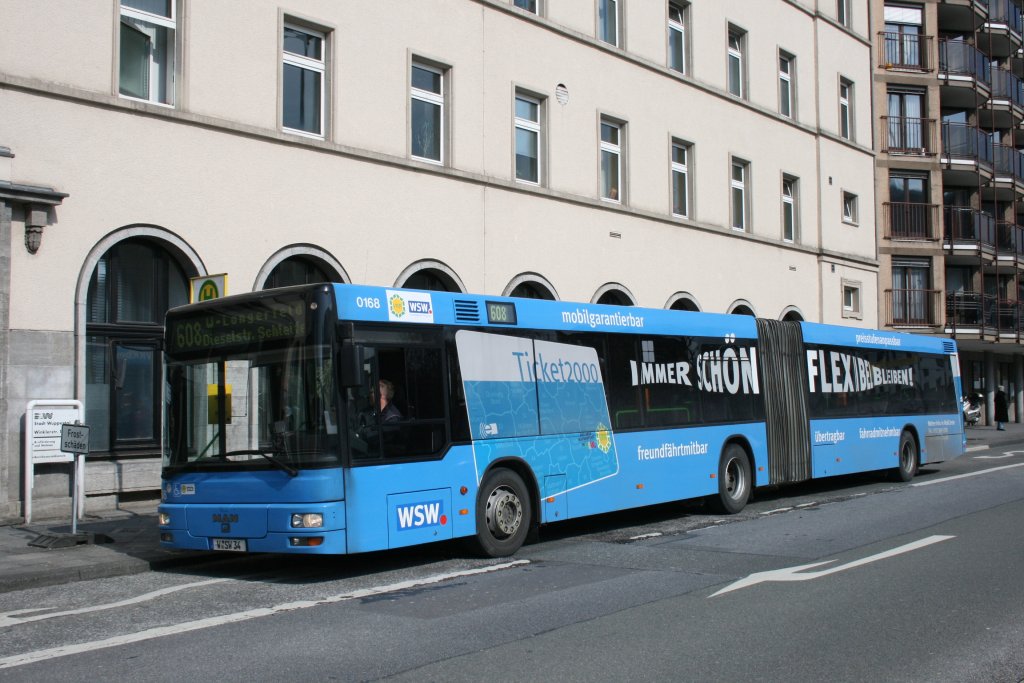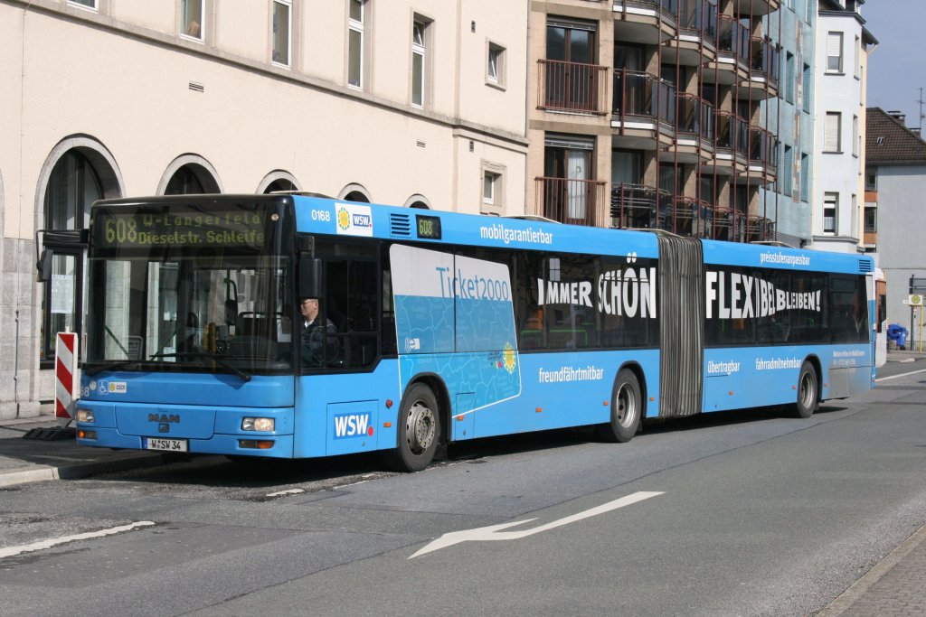 WSW 0168 (W SW 34) mit Werbung für das Ticket 2000. Aufgenommen am Bahnhof Barmen, 17.3.2010.