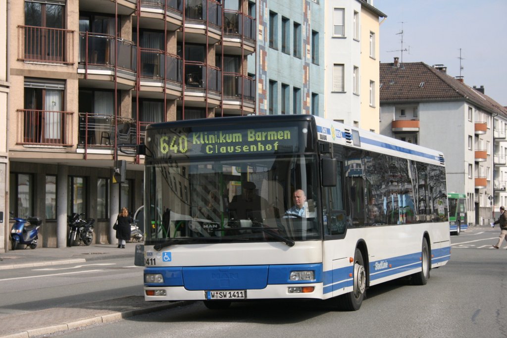 WSW 0411 (W SW 1411) mit der Linie 640 zum Klinikum Barmen. Aufgenommen am Bahnhof Barmen, 17.3.2010.