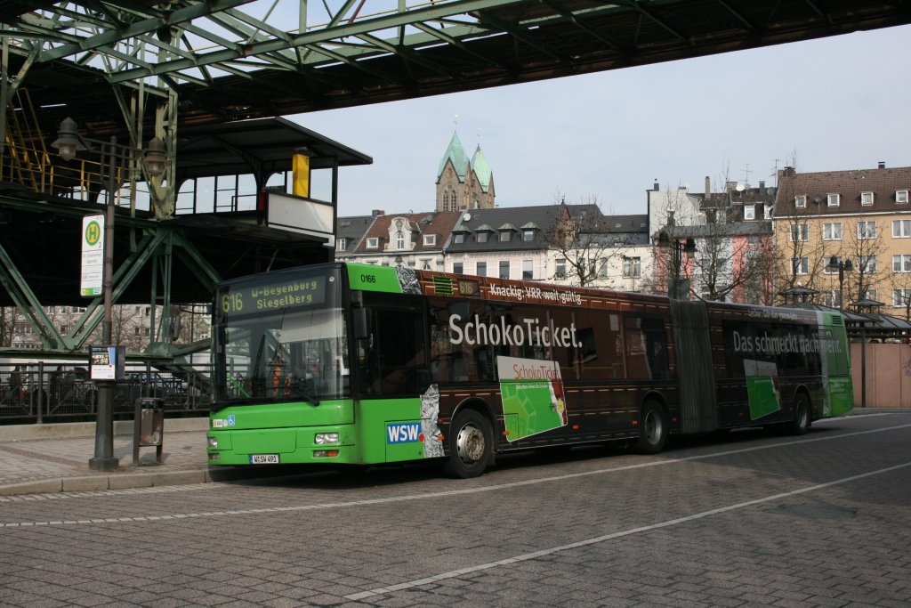 WSW 0166 (W SW 491) mit Werbung für das Schoko Ticket. Aufgenommen am Bahnhof Oberbarmen, 17.3.2010.